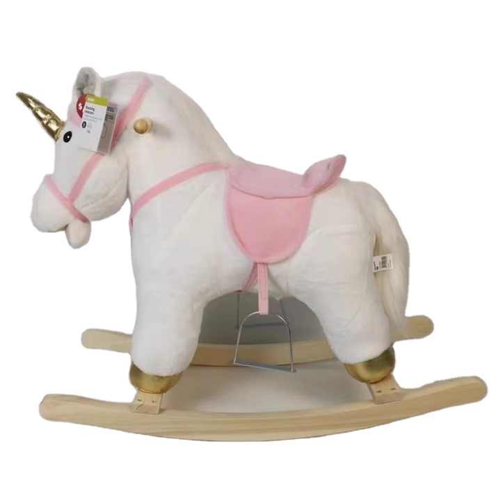 Cavallo a Dondolo Unicorno Imbottito Bianco in Peluche con Struttura in Legno, Giocattolo Cavalcabile per Bambini