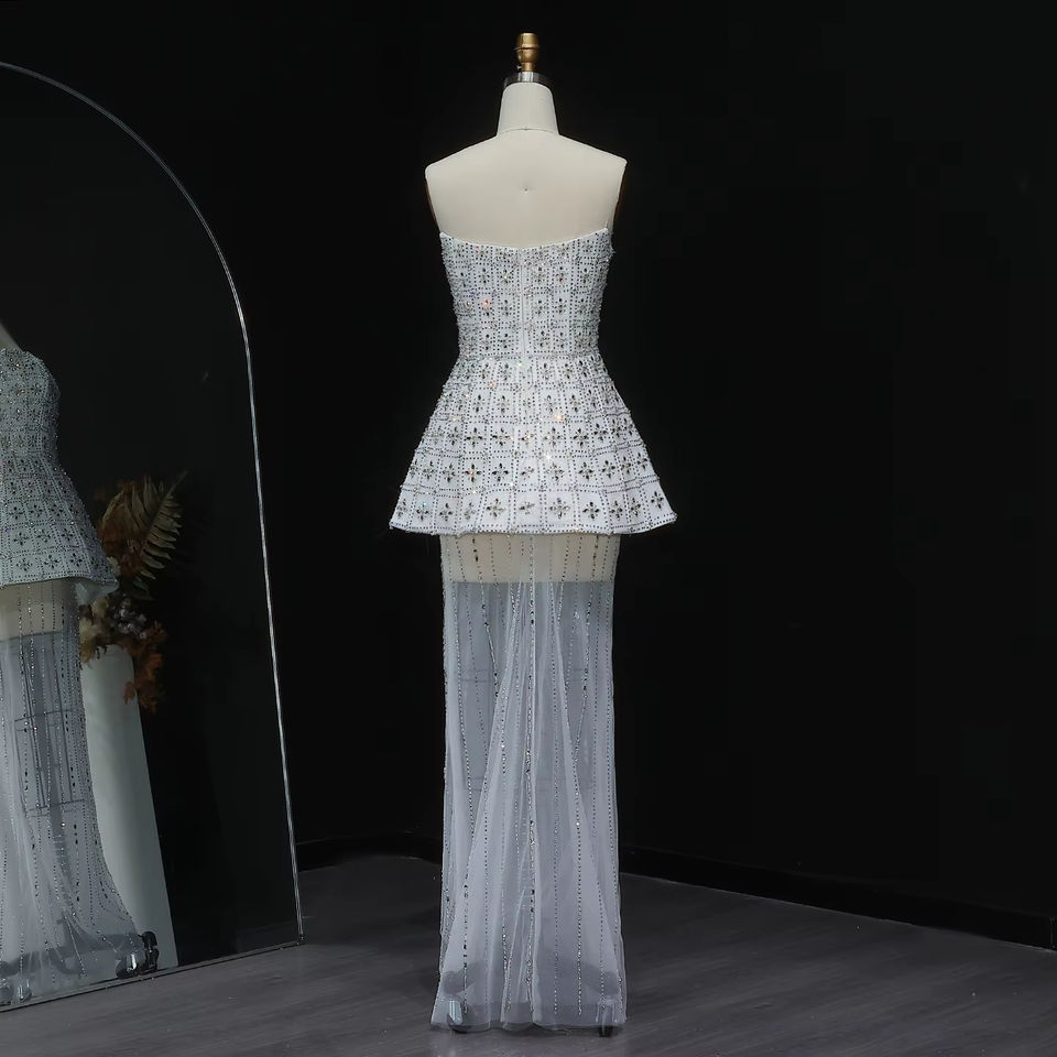Stunning Strapless Luxury Crystal Dubai White Evening Gown With Flowing Cape for Women Wedding Paty Lsz545