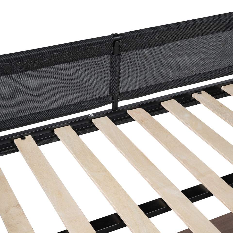 Sturdy Metal Full-Size Loft Bed Frame with Desk & Shelves Noise-Free Wood Slats Comfortable Textilene Guardrail