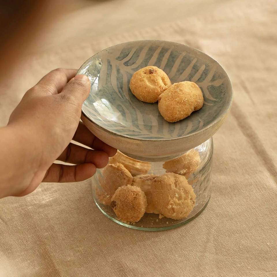Elegante barattolo di vetro 350 ML con coperchio a forma di ciotola in legno per la conservazione di snack e noci