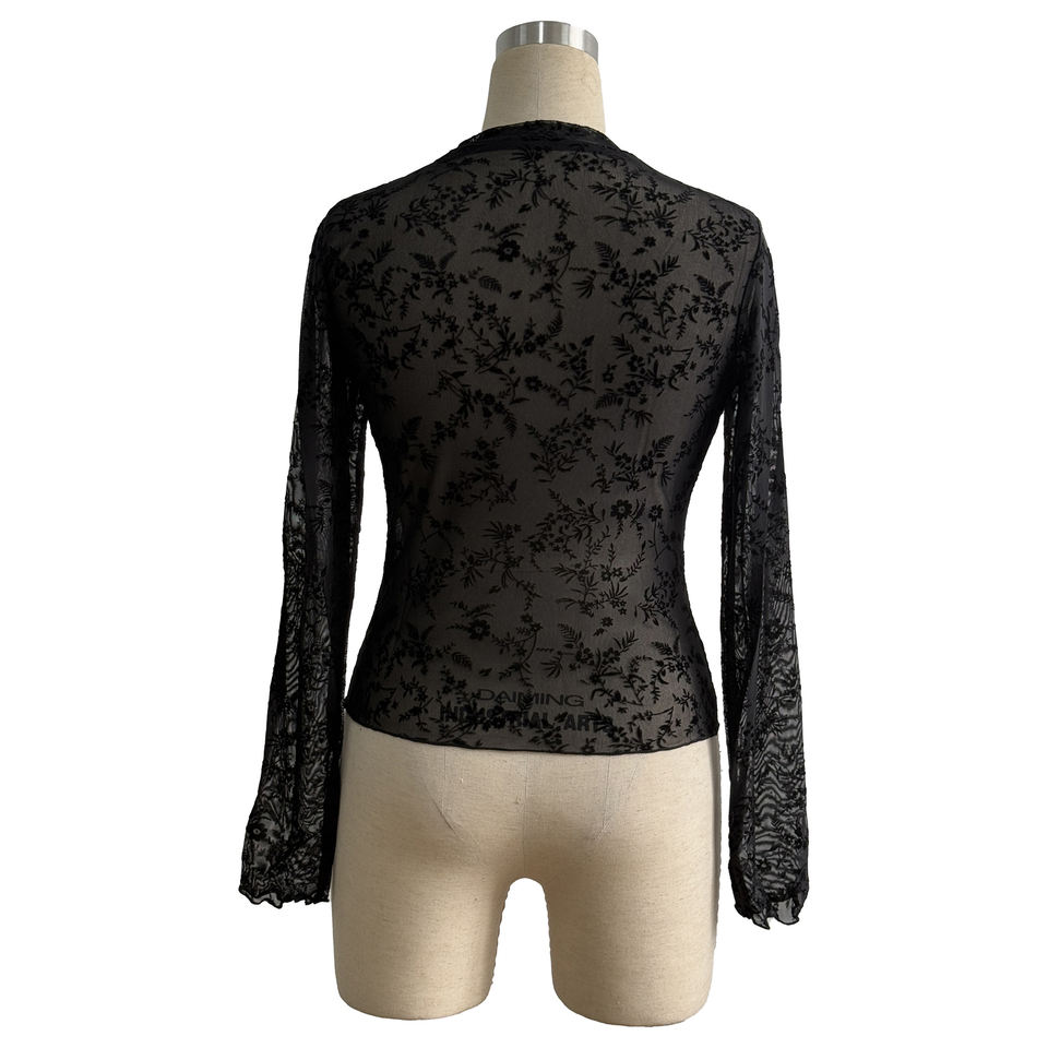 Stylish Black Mesh Blouse With Floral Motifs and Long Sleeves for Female Wearers Women's Long-sleeve T-shirt