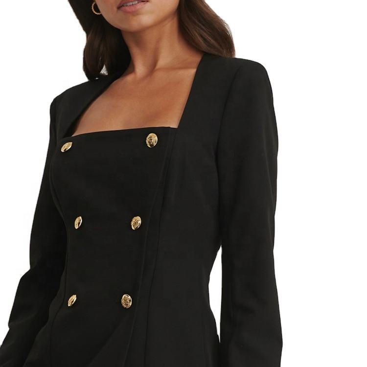 Stylish Gold Button Detail Square Neck Long Sleeve Double Breasted Women Fashion Blazer Dress