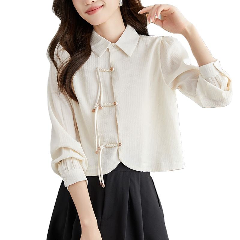 Stylish Women Light Stripe Silk Short Shirt Beaded Knot Button Satin Blouses