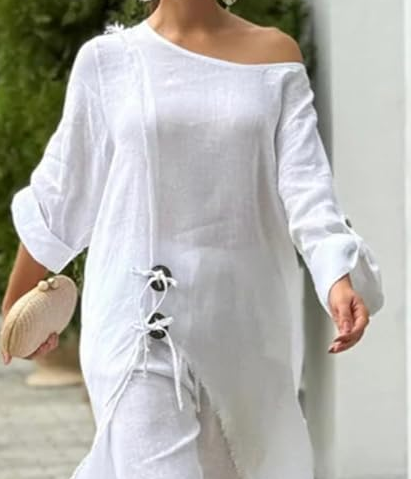 Top a tunica a manica lunga asimmetrica a due pezzi bianco da donna alla moda con pantaloni larghi larghi abbigliamento Casual estivo