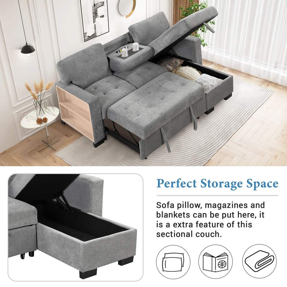 Elegante e Funzionale Divano Letto Sezionale con Chaise Longue, Scaffale Portaoggetti, Tavolino Estraibile e Caricatore USB