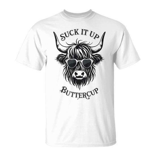 T-shirt Suck IT Up Buttercup Highland Cow bianca unisex per adulti taglia M
