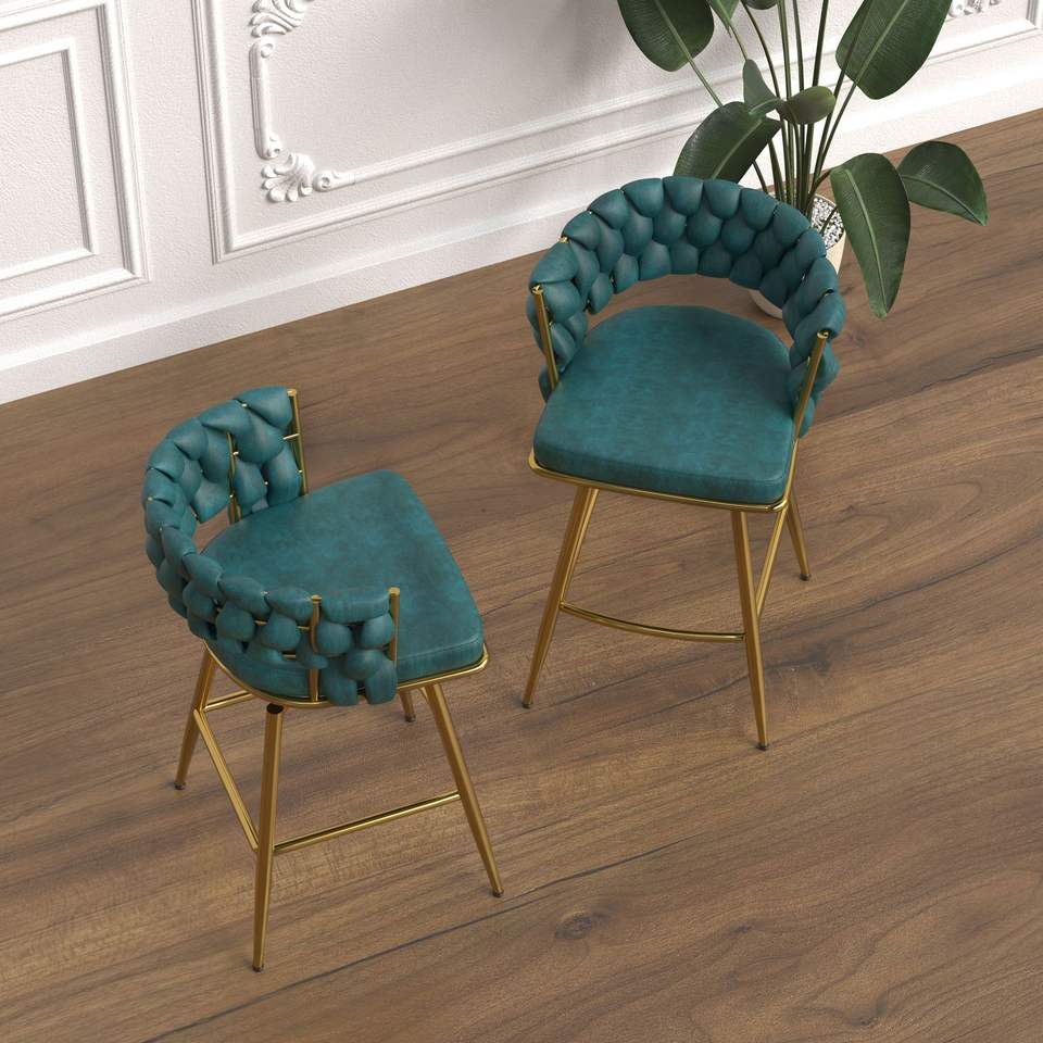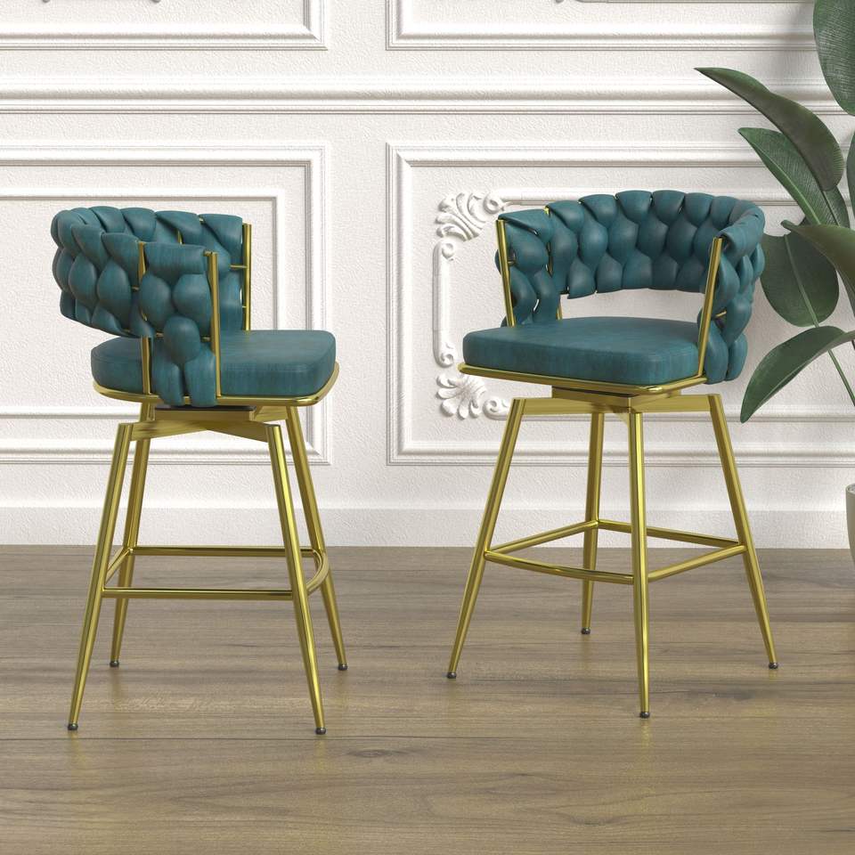 Set di 2 Sgabelli da Bar in Camoscio Intrecciato, Girevoli a 360° con Gambe Dorate, Sedie da Cucina Non Regolabili, Sgabelli Imbottiti Girevoli a 360 Gradi