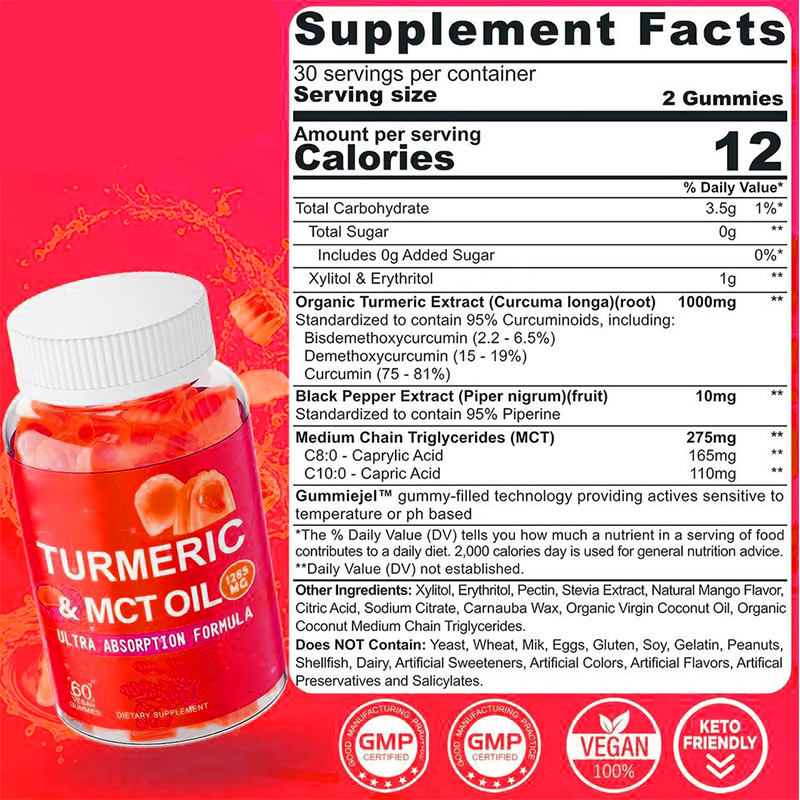 Sugar Free Turmeric Curcumin Gummies Turmeric with MCT Oil C8 Black Pepper Extract Support Antioxidant