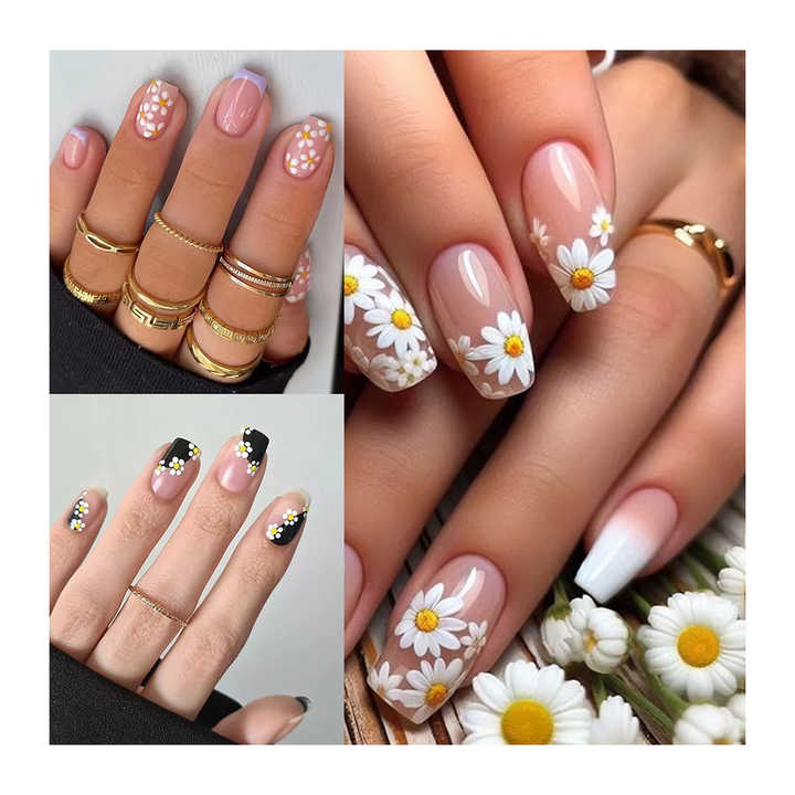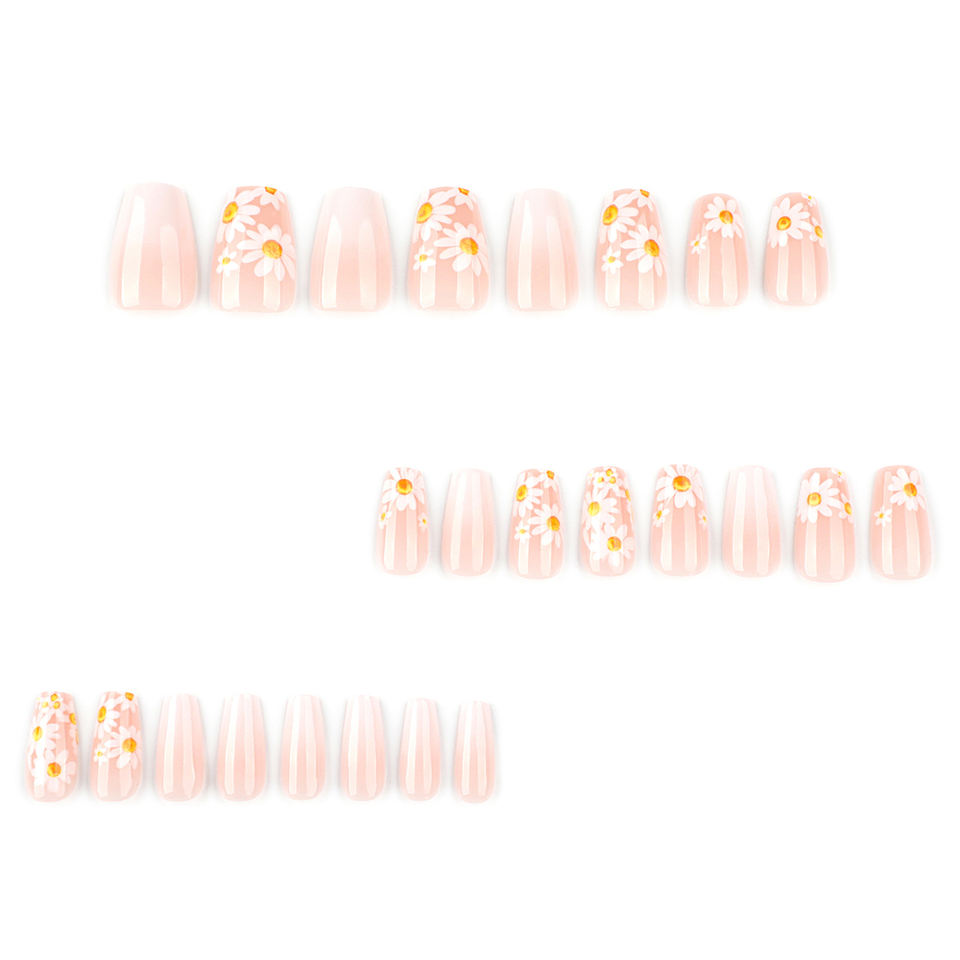 Set Estivo di 24 Unghie Finte Stile Francese con Margherite e Sfumature Nude per Nail Art e Salone