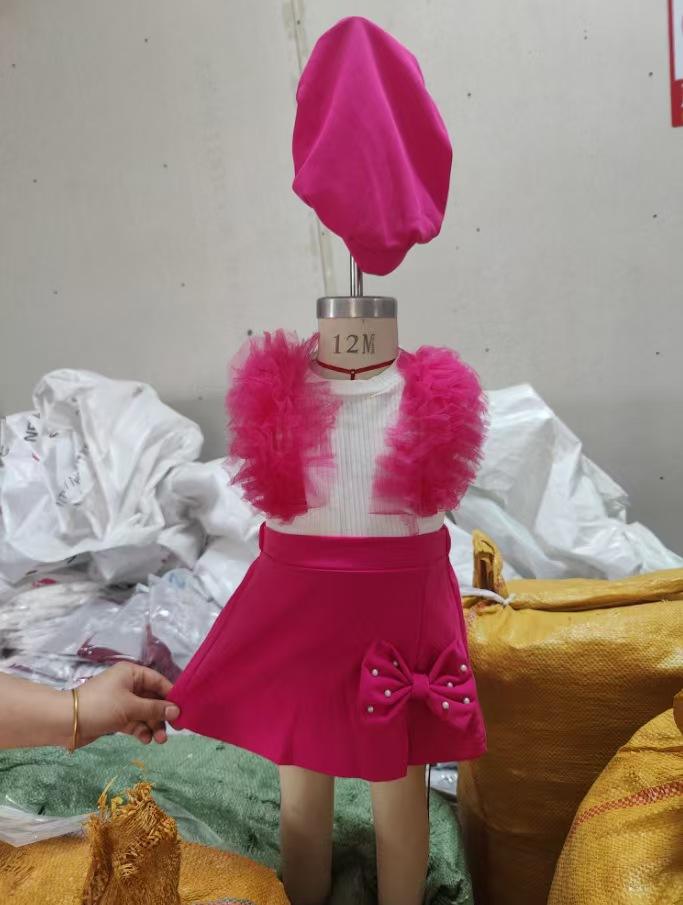 Summer 6M-3Y Girls' Sleeveless Mesh Pit Strip Top+Bow Half Skirt+Beret 3PCS Girls Clothes Set
