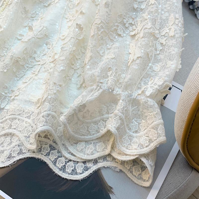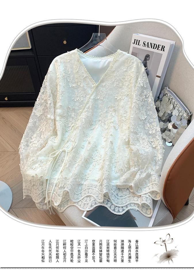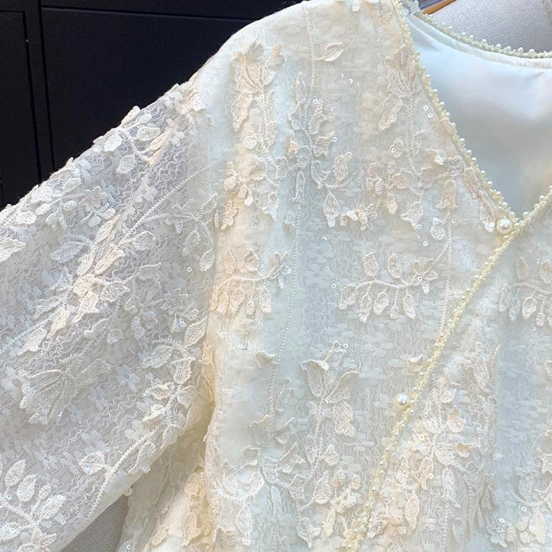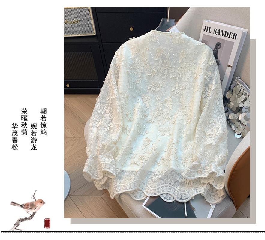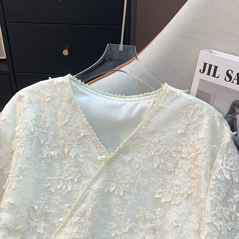 8952 # Camicetta in Pizzo alla Moda per Donna, Elegante e Giovanile, Tinta Unita, Camicia in Pizzo Larga e Casual, Top da Ufficio per Signora