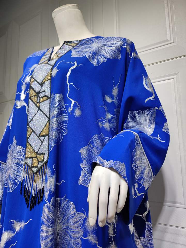 Summer Blue Muslim Women's Dress Abaya Hot Gold Flowers Beaded Dangling Beard Ethnic Wind Comfortable Breathable Dress