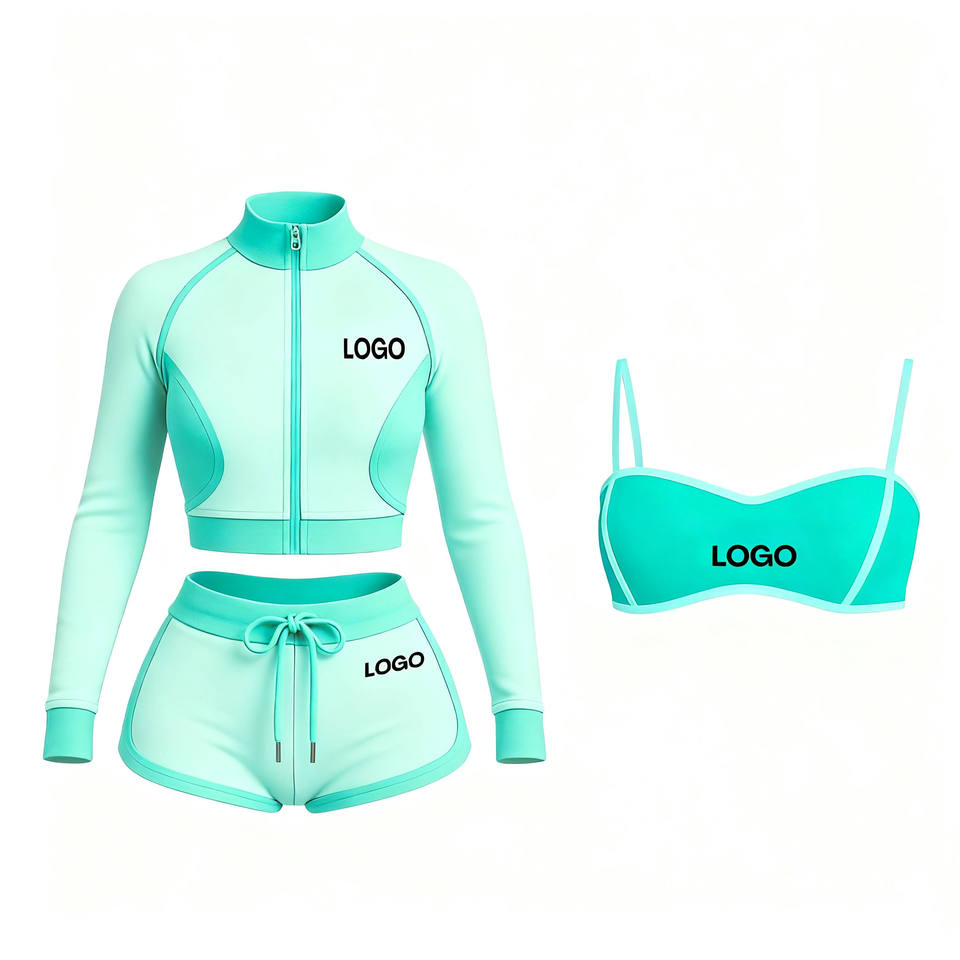Completo Estivo da Donna in 3 Pezzi, Tuta Sportiva Personalizzata, Top Bralette, Giacca e Pantaloncini in Colori Contrastanti