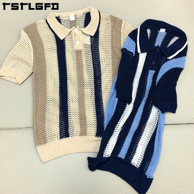 Maglietta estiva personalizzata a righe all'uncinetto con bottone cavo a maniche corte con collo alto Cardigan da uomo maglione Jacquard t-Shirt
