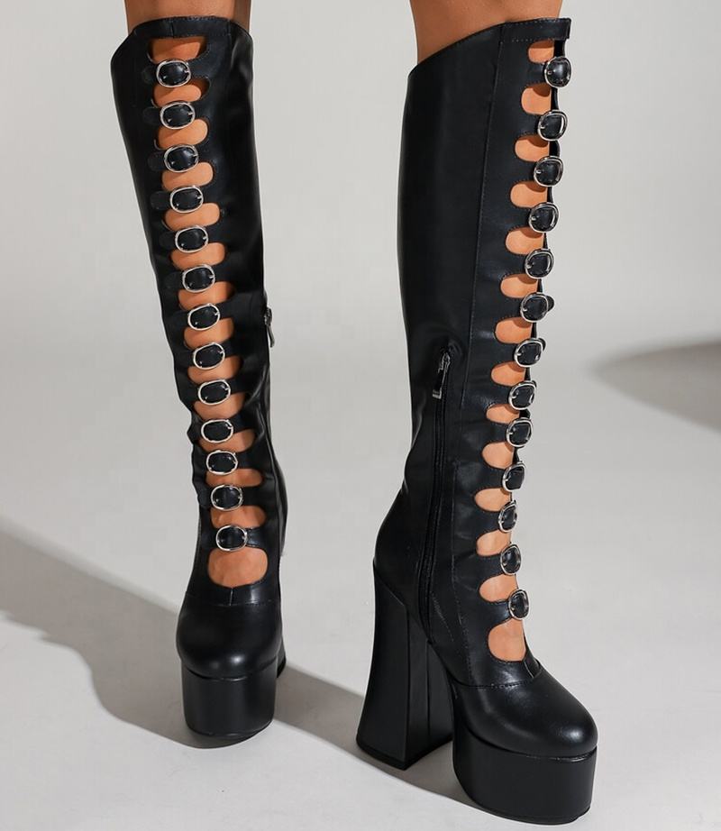 Stivali Estivi Alti al Ginocchio da Donna con Cut-out, Fibbie, Plateau e Tacco Grosso, Scarpe con Cerniera Laterale, Stivaletti Lunghi Viola, Altezza Tacco 15cm