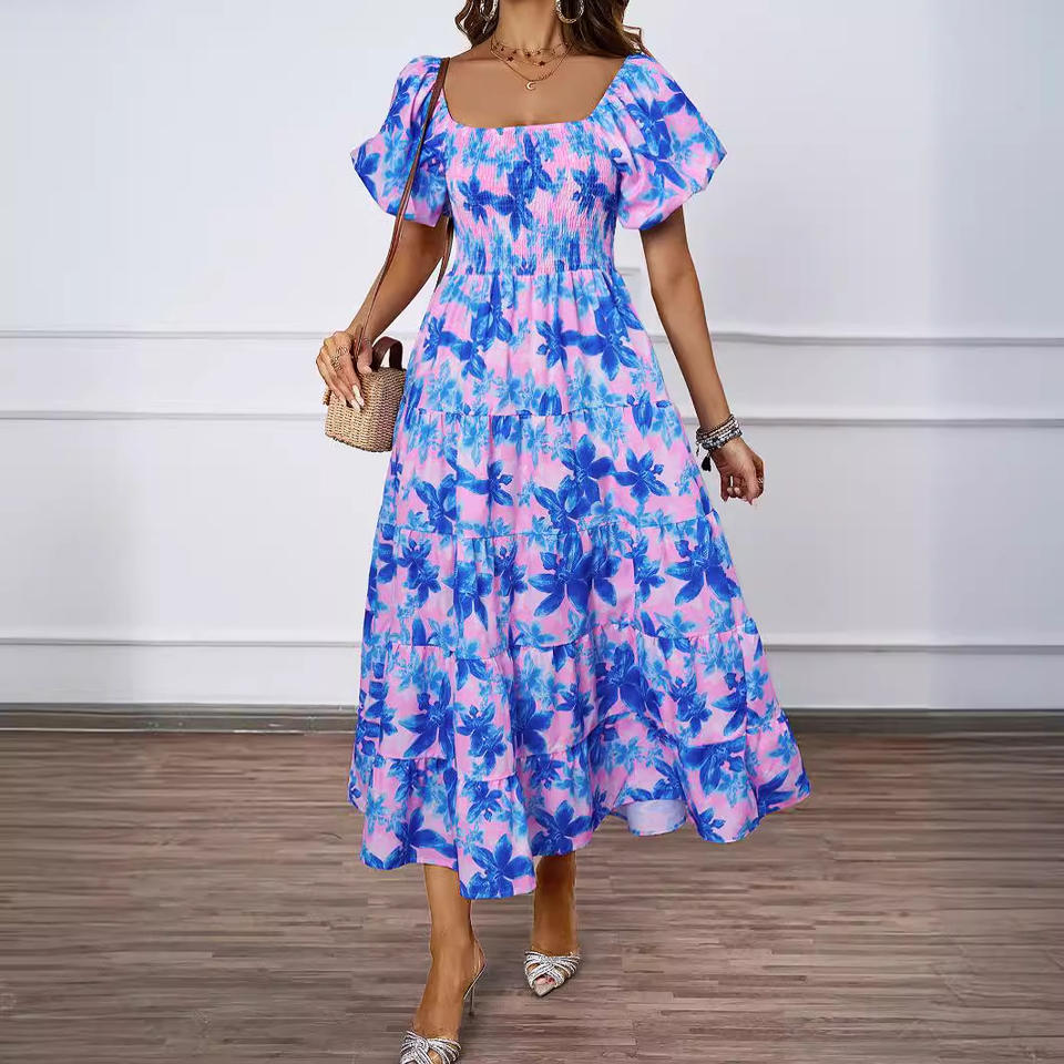 Summer Elegant Women's Casual Floor-Length Dress Independent Station's New Off-Shoulder Printed Puff Sleeve Chiffon Natural ODM