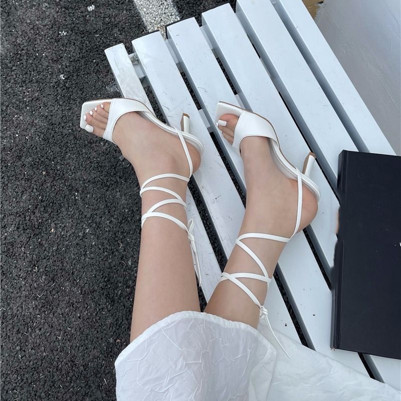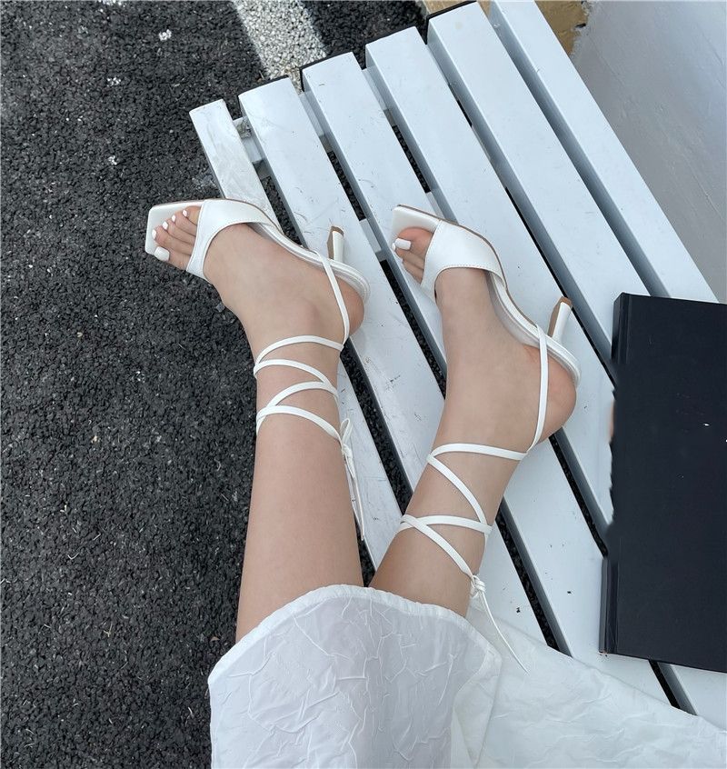 Summer Fashion Women Thin High Heels Rome Sandals White Blue Heels Lace up Sandals Open Toe Slides Party Shoes