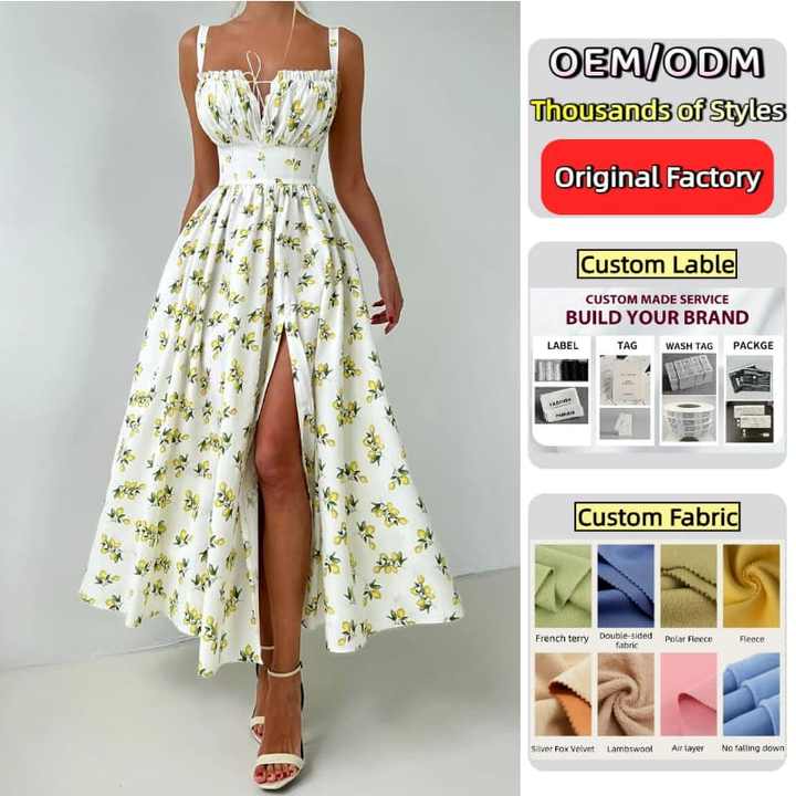Abito Estivo Floreale a Mezza Gamba, Vestito Fluido a Linea A con Spalline Sottili, Arricciato con Spacco Alto per Vacanze