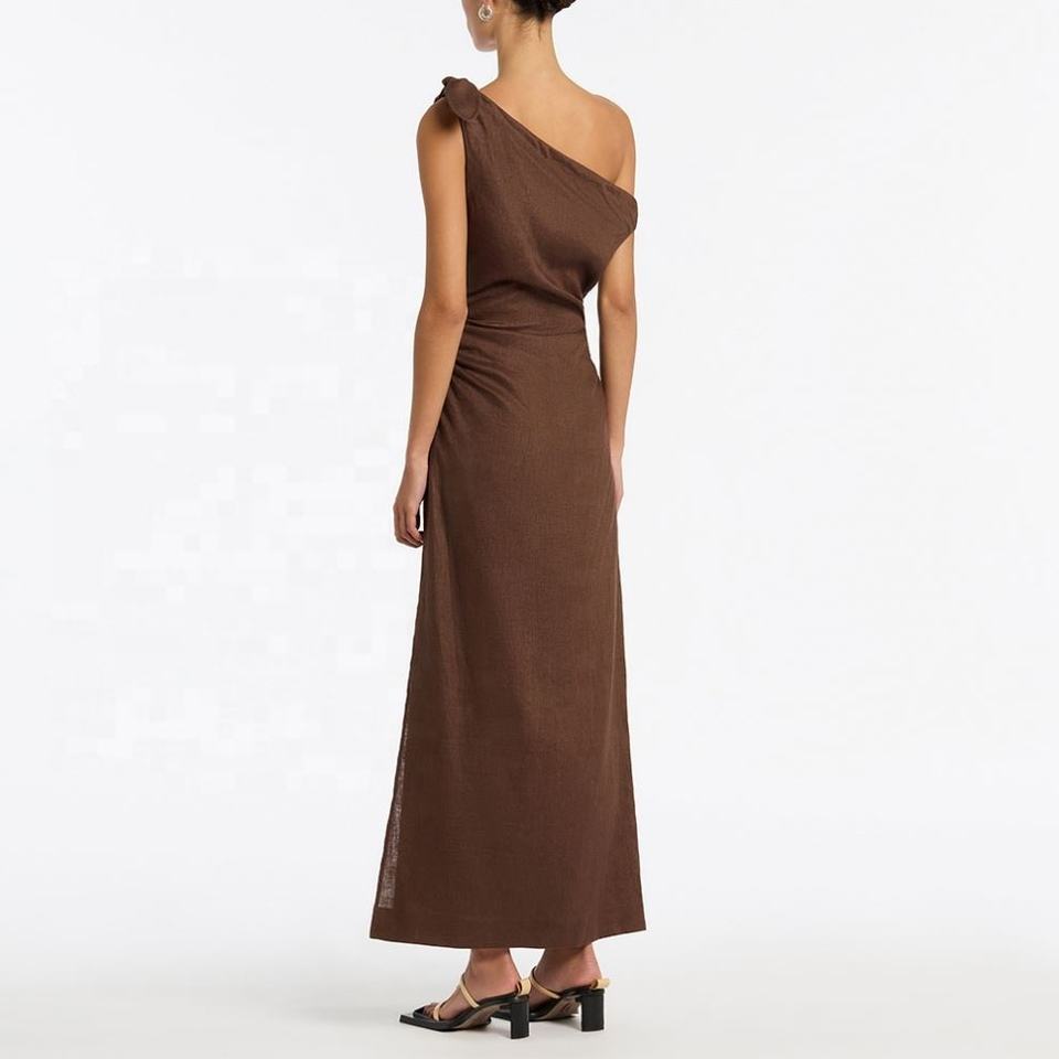 Summer High Quality 100% Linen Fabric for Women's Clothing One-Shoulder Sleeveless Casual Maxi Dress High Split Long Lady Dress