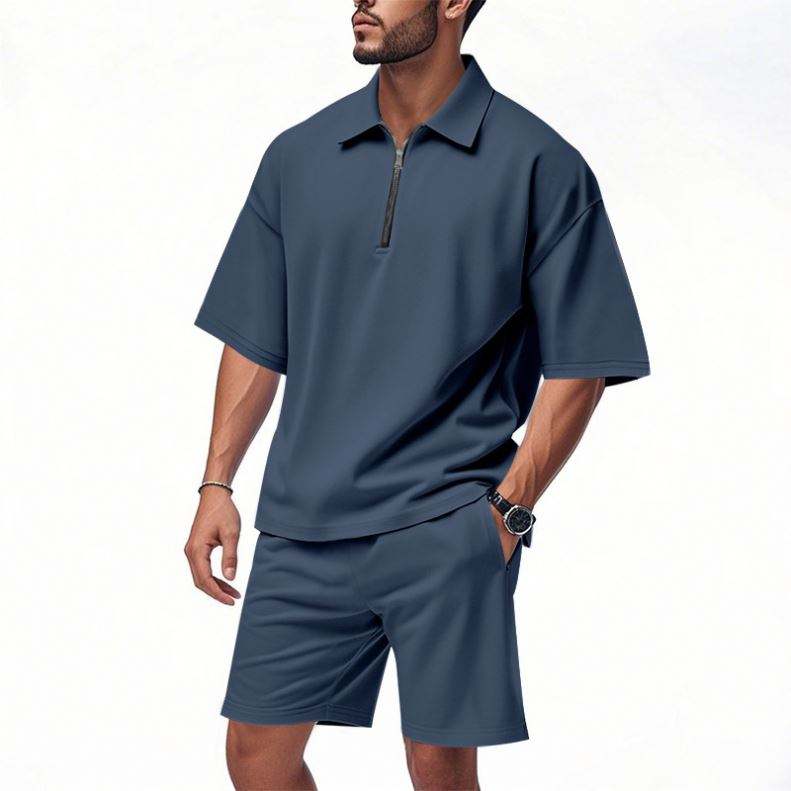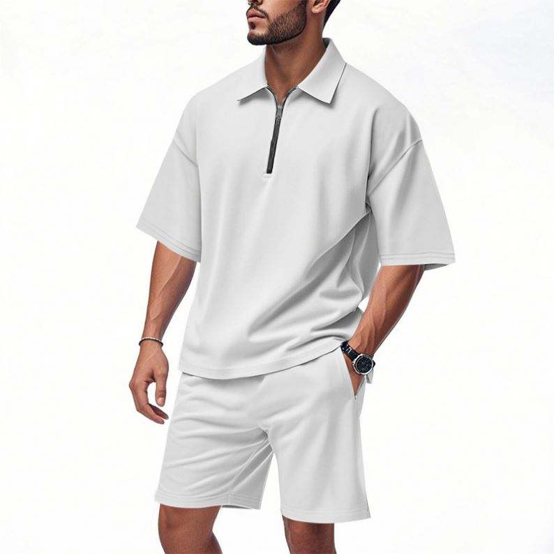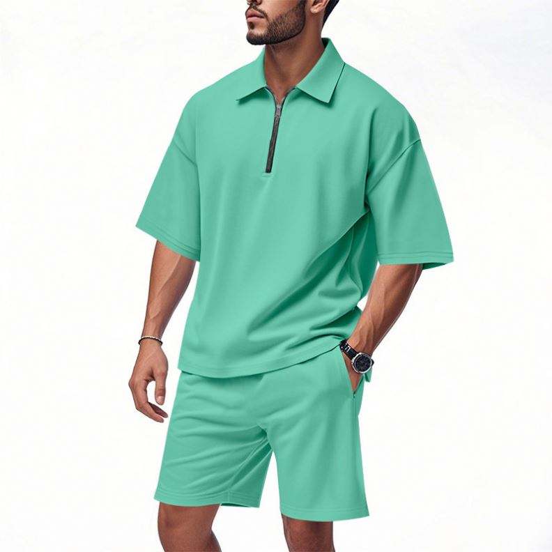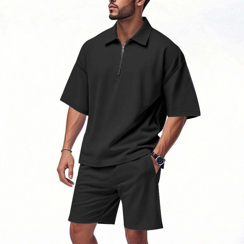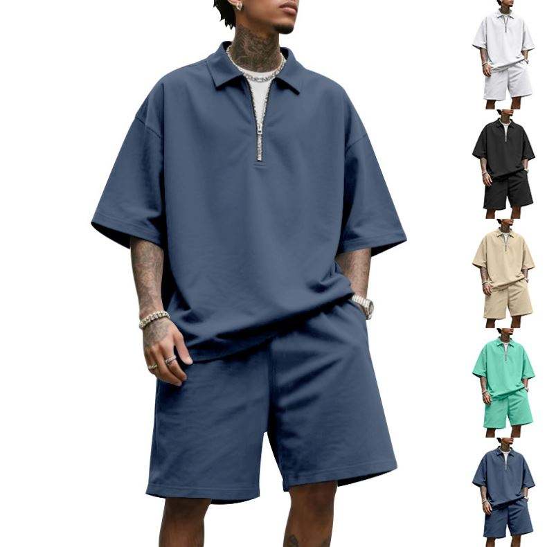 Summer Men's Loose Collar Hip-Hop Zippered Polo High Street Casual Short Sleeve Short Pants Tracksuits for Men