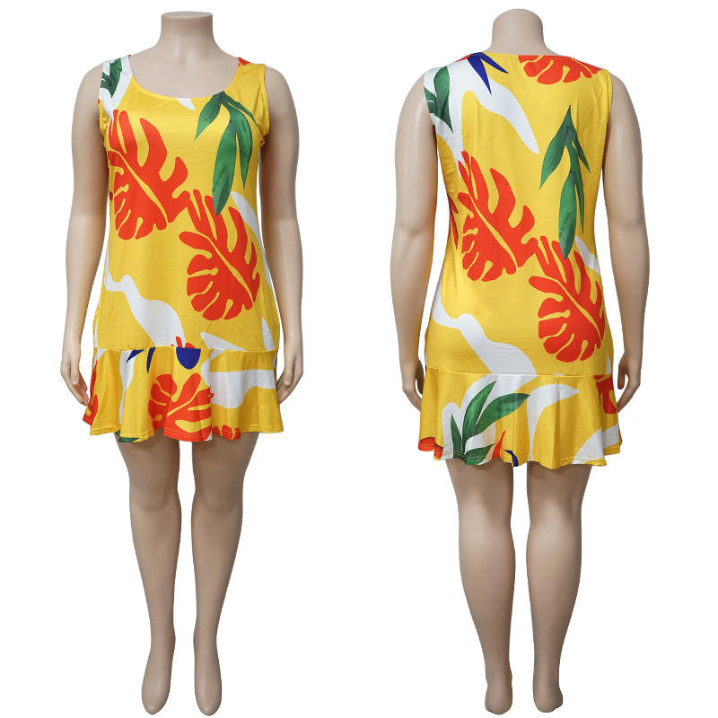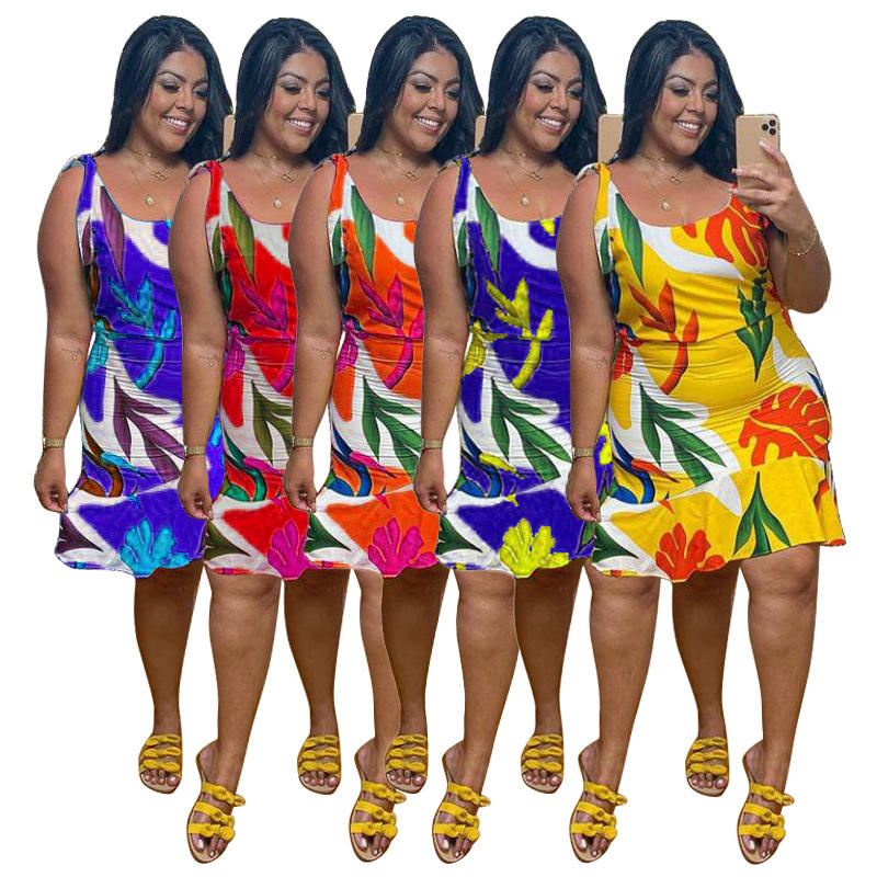 Summer New Casual Plus Size Women's Dress Mid-Length Waistline Sleeveless Floral Digital Print Washable Lady Clothing XXL