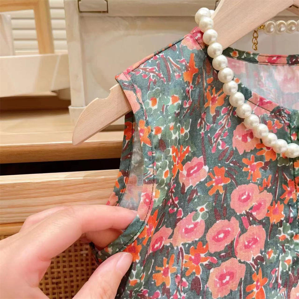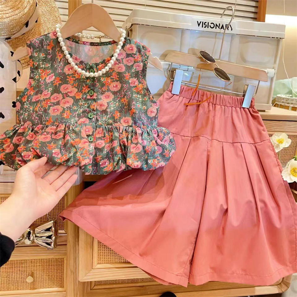 Summer New Fashion Floral Sleeveless Vest Top Pink Skirt Pants 2 PCS Girls Children's Clothing Sets for 3-8 Years