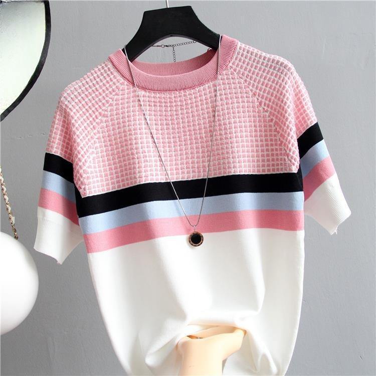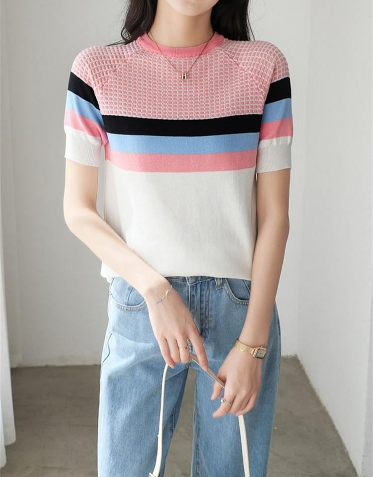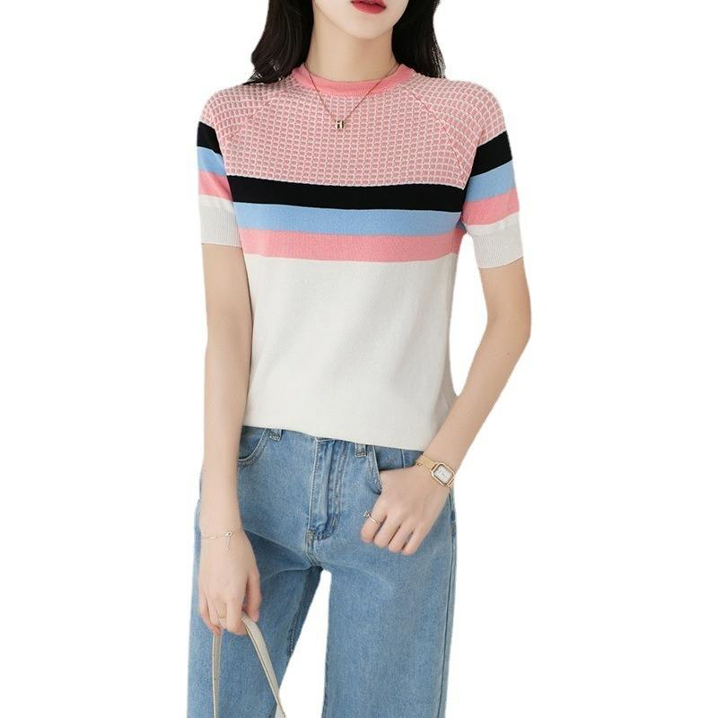 Nuovo maglione estivo coreano a contrasto in seta lavorato a maglia da donna Pullover Slim Fit t-shirt tinta unita manica corta