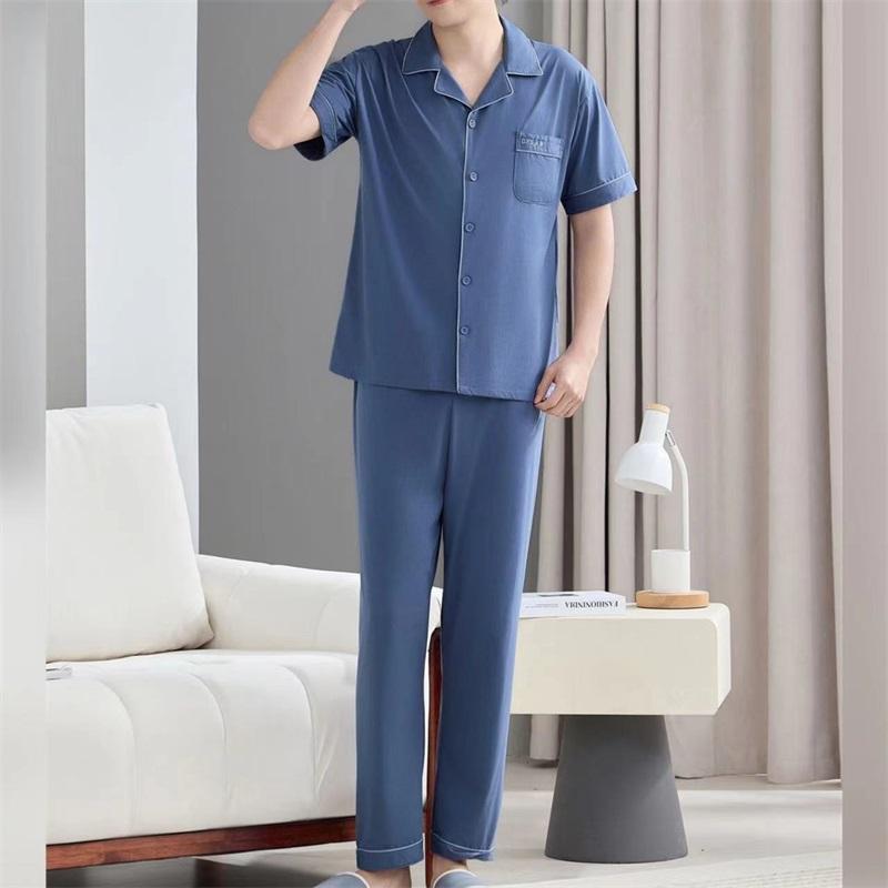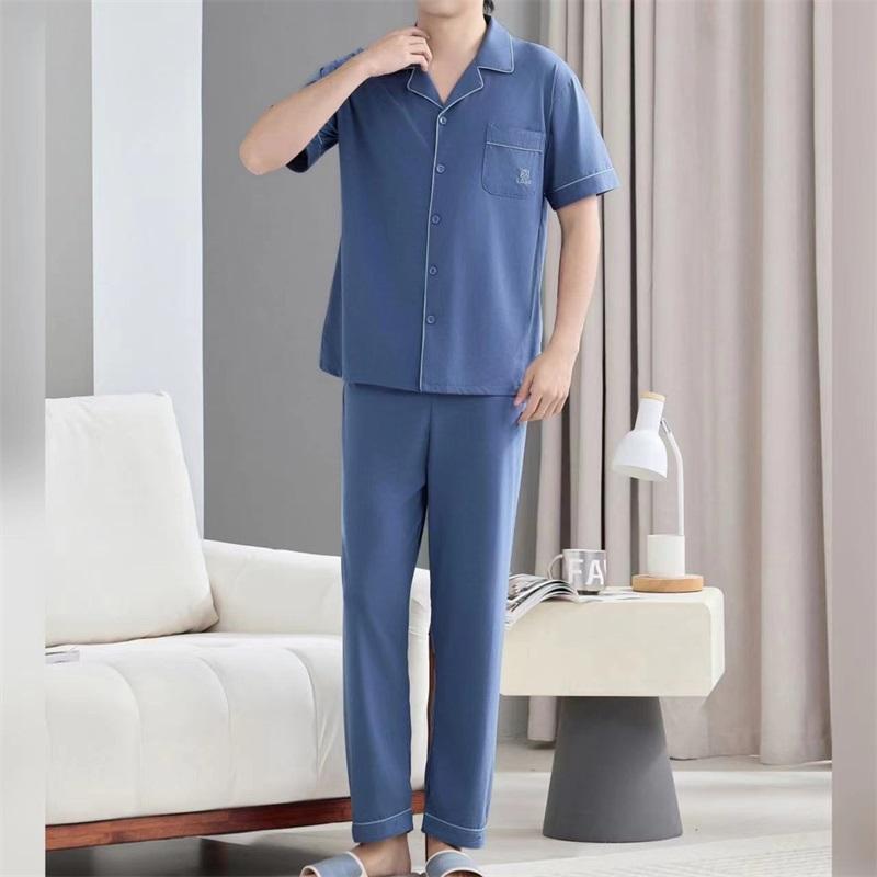 Summer New Men's Casual Outdoor Home Wear Breathable Cotton Woven Short-Sleeved Long Pants Set Lapel Pajamas Cartoon Pattern