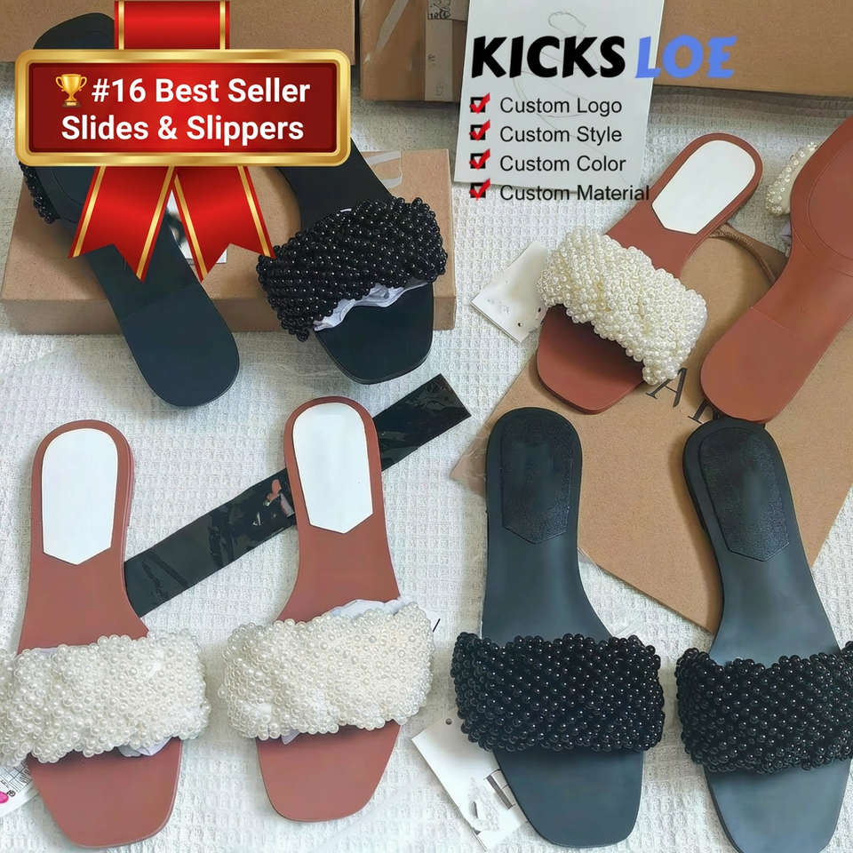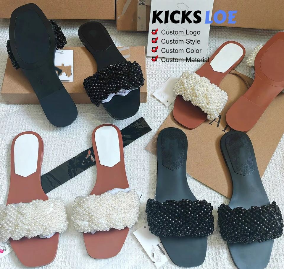 Sandali piatti da donna con cinturino singolo e punta quadrata, nuovi arrivi estivi, con intarsi di perle artificiali, alla moda, per l'ingrosso