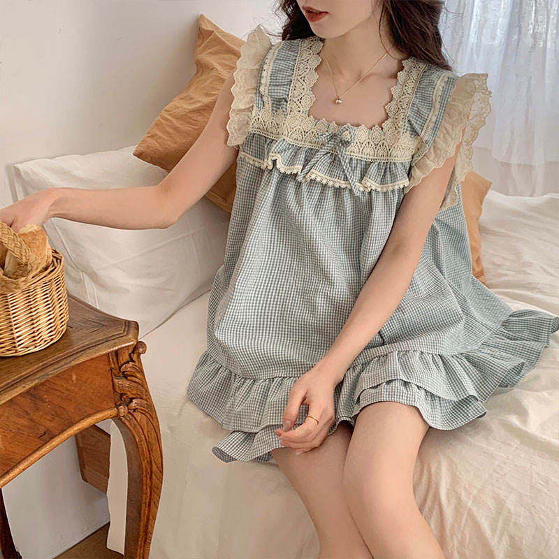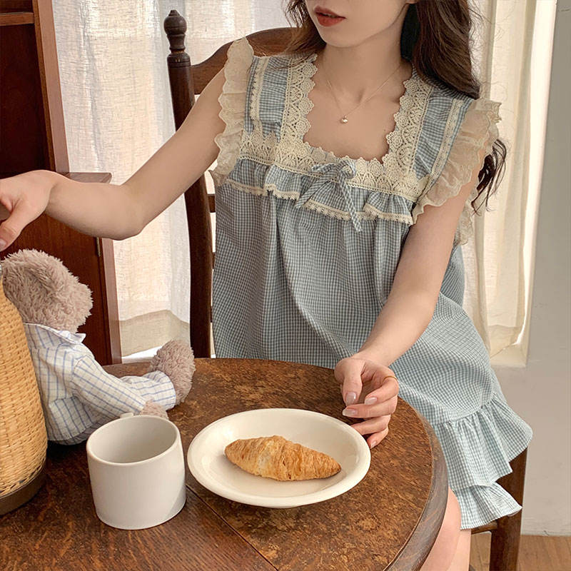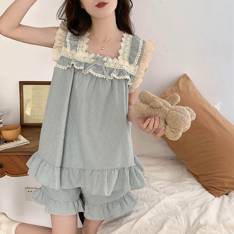 Camicia da notte estiva da donna, sottile senza maniche con volant e Design a quadri, Set in due pezzi per la casa
