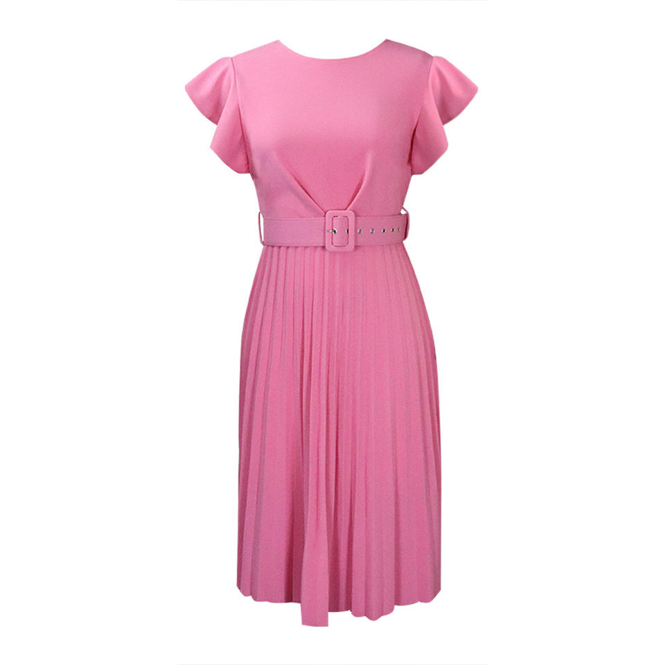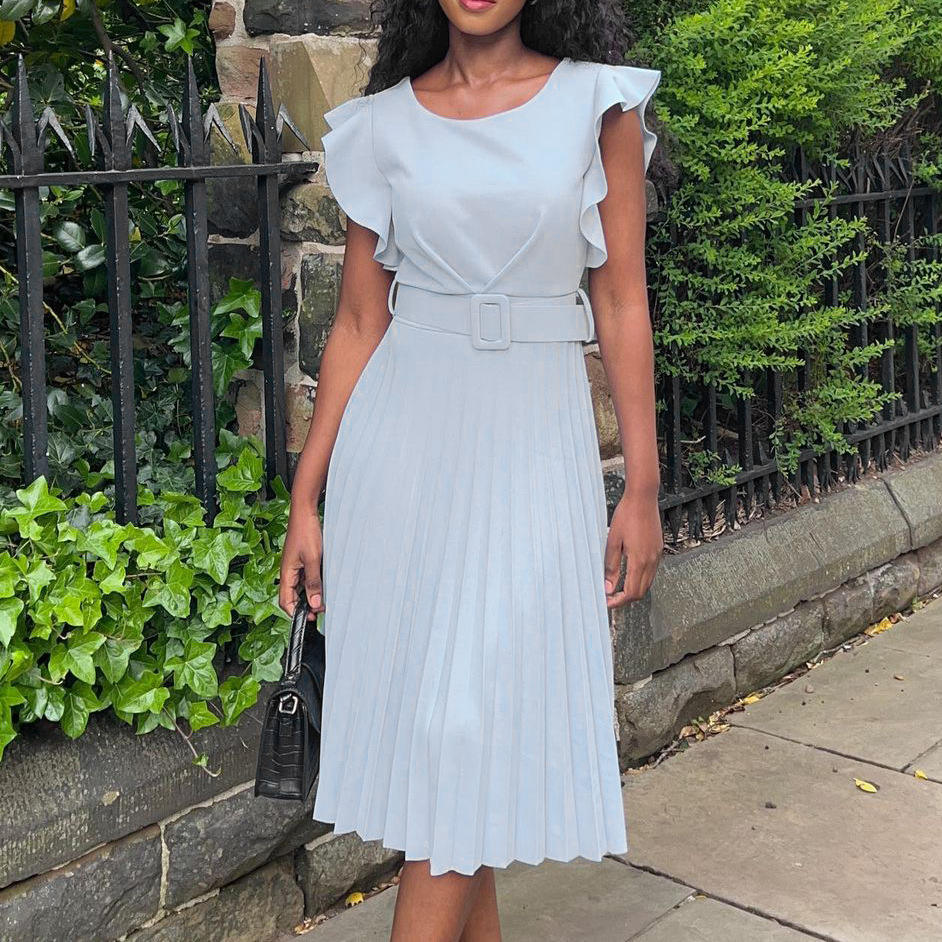 Abito Estivo da Donna con Maniche a Volant, Tinta Unita, Plissettato, Elegante e Semplice per Ufficio, con Cintura