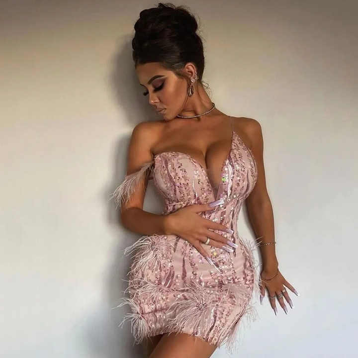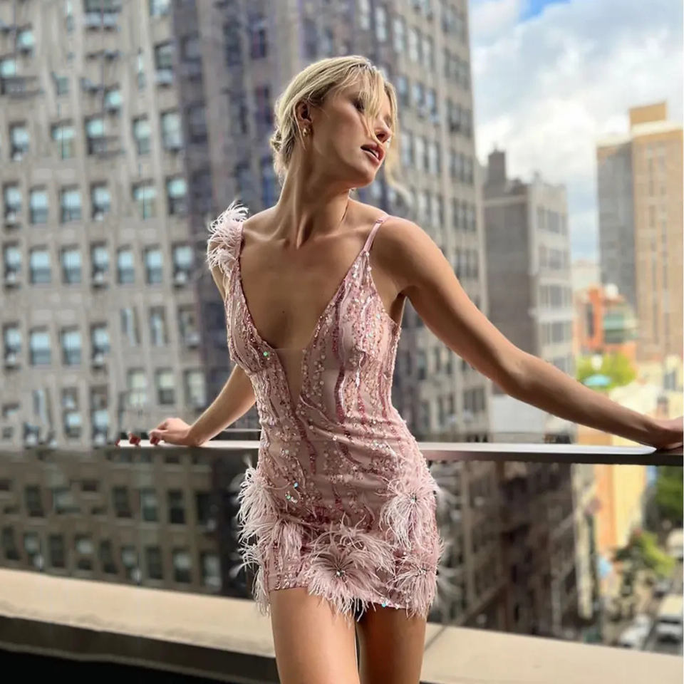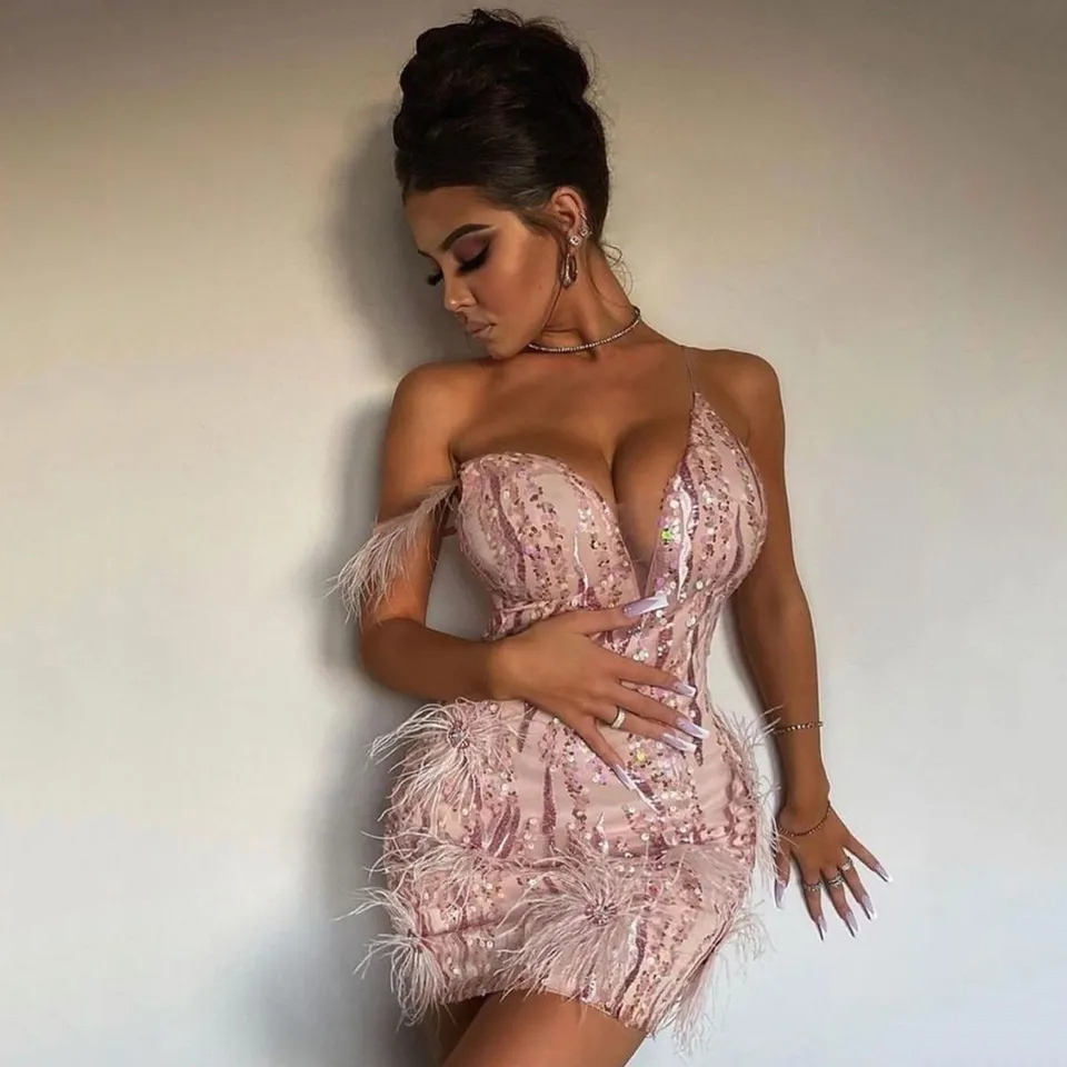 Estate Sexy cinturino paillettes profondo scollo a v Club Dress tessuto personalizzato moda discoteca Mini abiti da Cocktail da donna