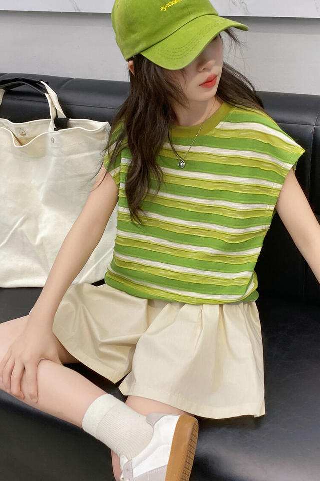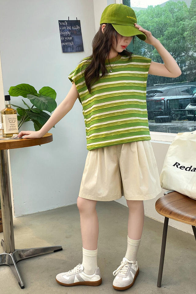 Set da ragazza alla moda estivo in due pezzi per le vacanze in spiaggia gilet a righe verdi e pantaloncini larghi Beige