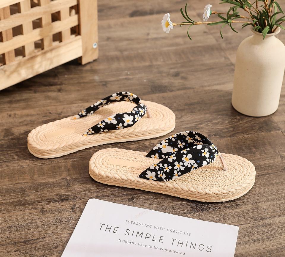 Products Name:flowers outdoor flat faux straw flip flops slides slipper sandals