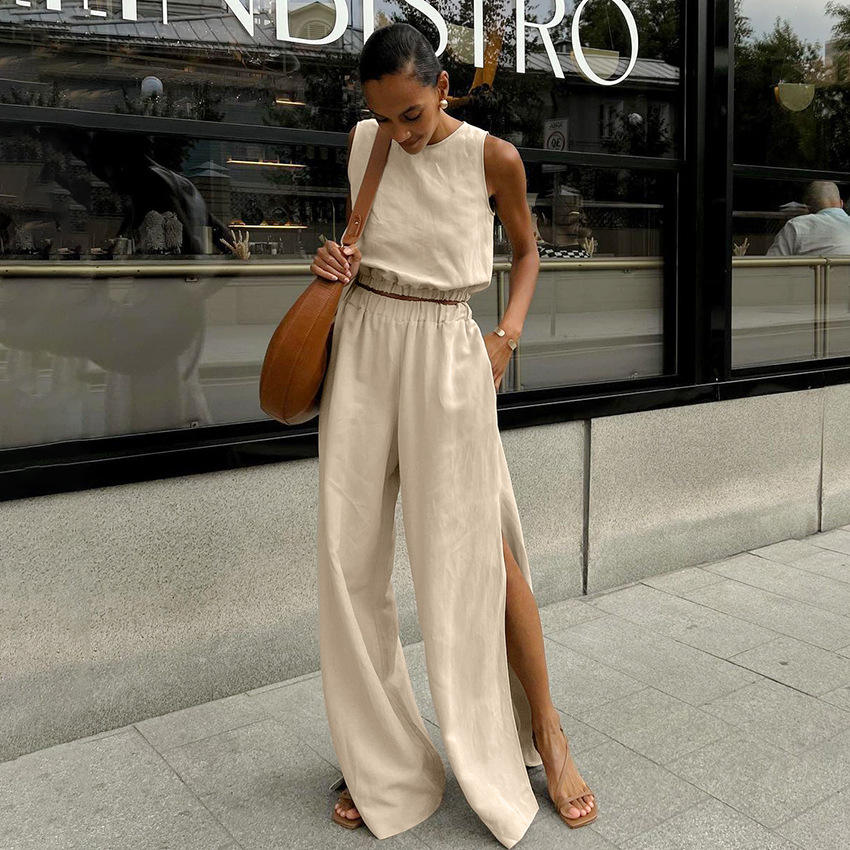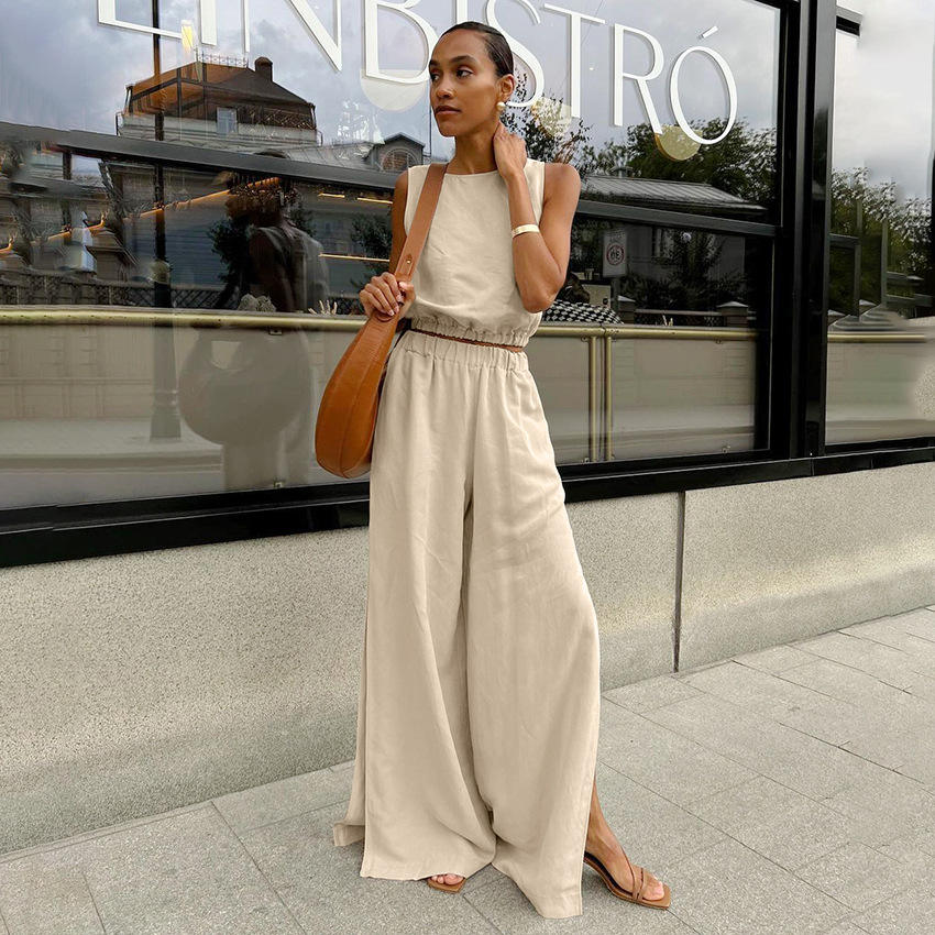 Summer Women's Home Clothes Pink Cotton Linen Sleeveless Two-Piece Pajamas Loose Short Sleeve Top Tee with Long Pants