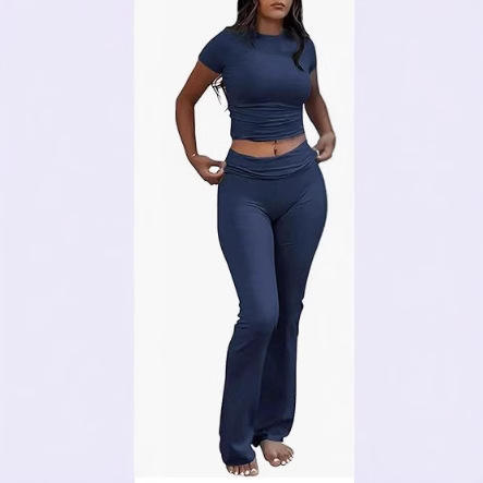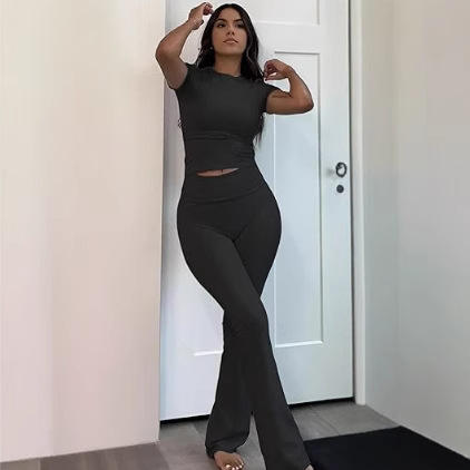 Summer Yoga Sportswear Suit for Women Europe US Cross-Border Two-Piece Crew Neck T-Shirt Low Waist Flared Pants for Leisure