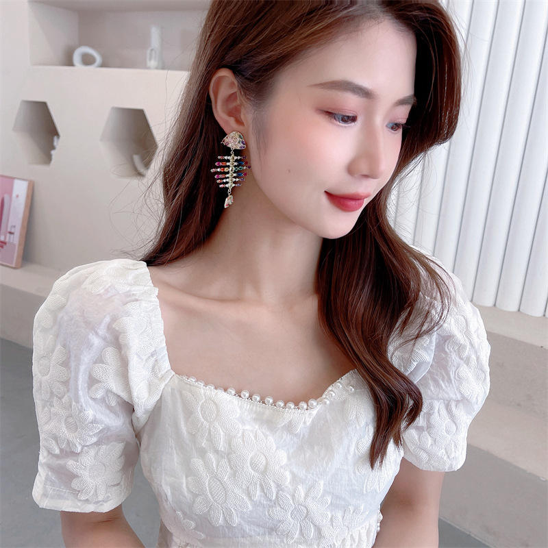 Sunnice INS Luxury BOHO Fish Bones eleganti orecchini in materiale rame con zircone intarsiato alla moda gioielli colorati OEM Factory