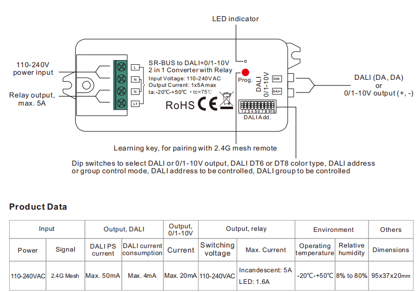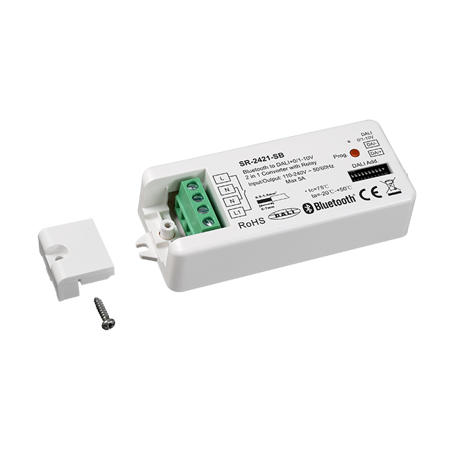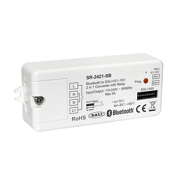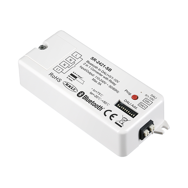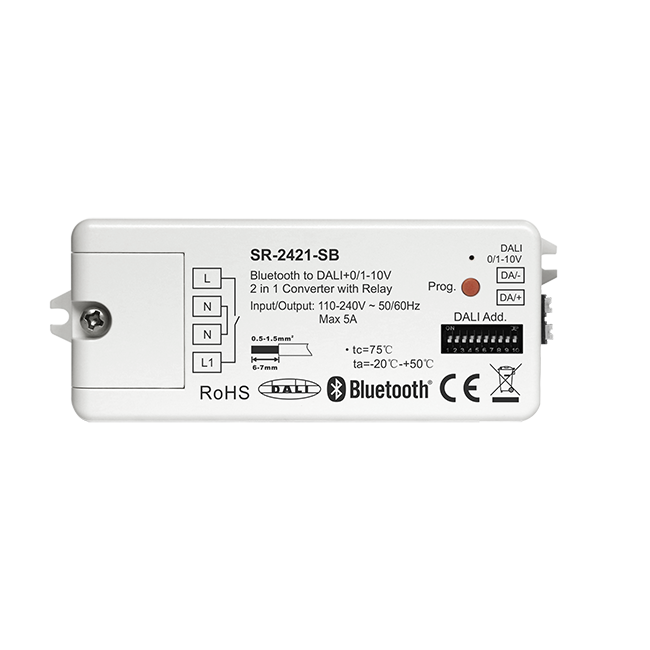 Convertitore Sunricher RF 2.4G Mesh a DALI+0/1-10V 2 in 1 con DALI PS 50mA integrato e relè 5A controllato tramite telecomando RF e app intelligente