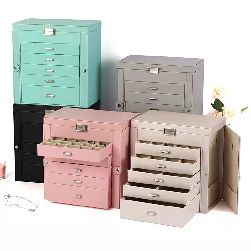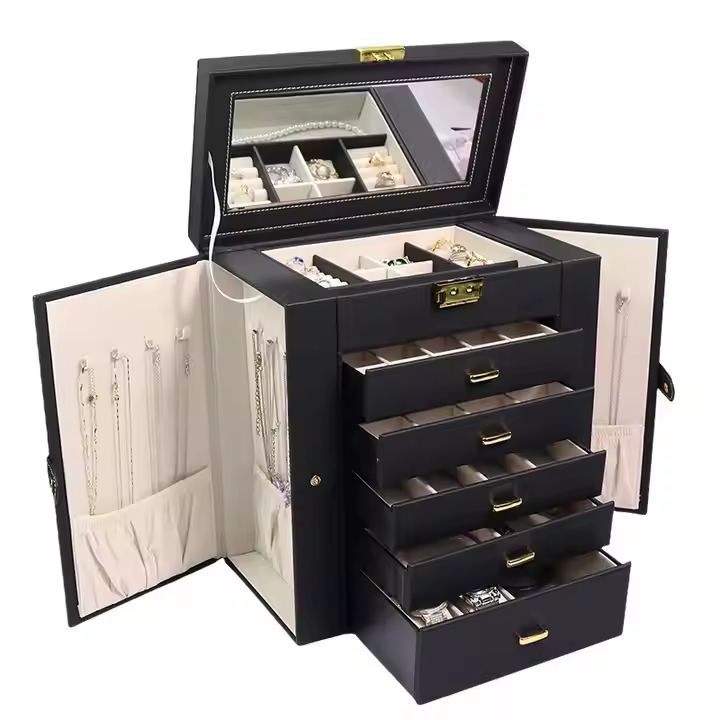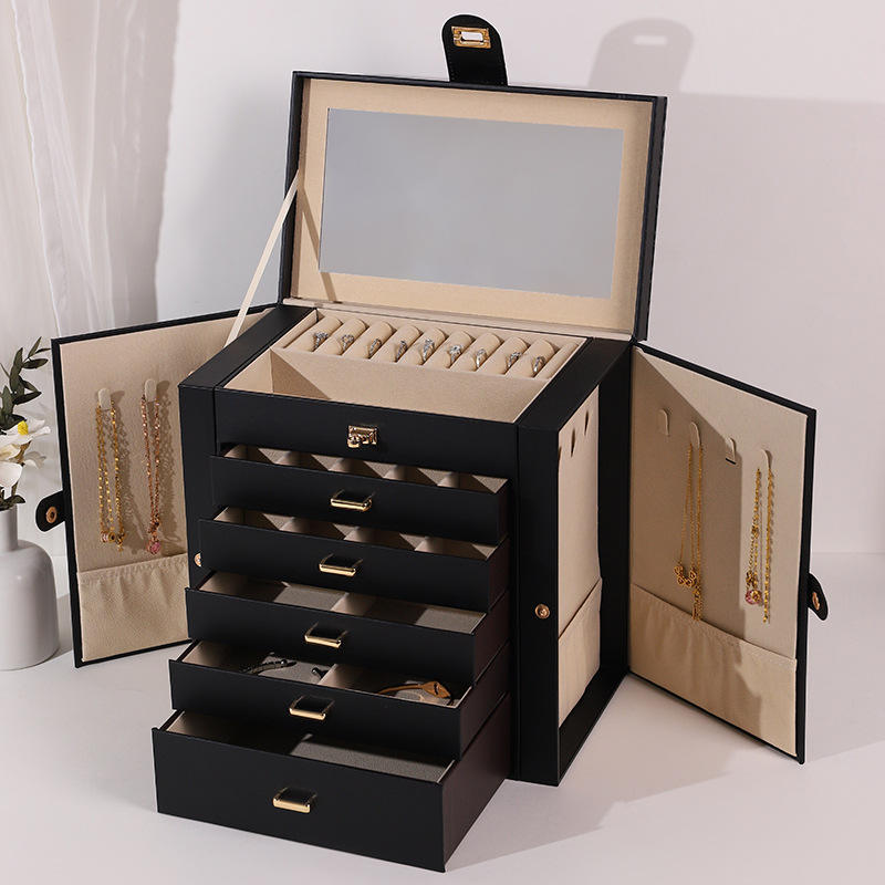 Portagioie in Pelle Rettangolare con Grande Capacità, Chiudibile a Chiave, Organizzatore per Anelli e Orecchini, Custodia con Specchio e Supporto in Metallo