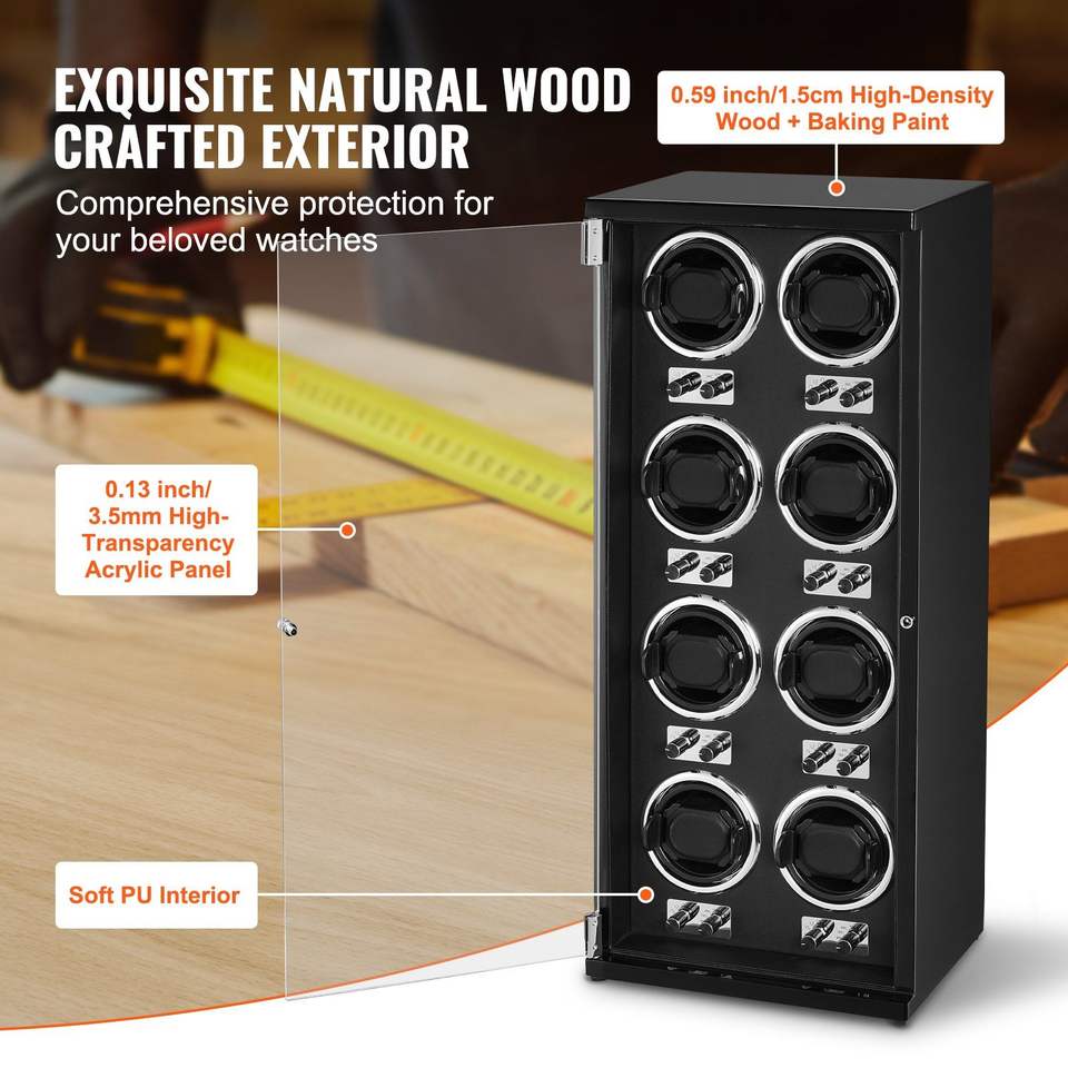 Super Quiet Japanese Mabuchi Motors Watch Winder 8-Slot Black PU Shell Blue LED Light High-Density Board for Mechanical Watches