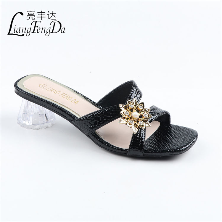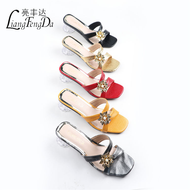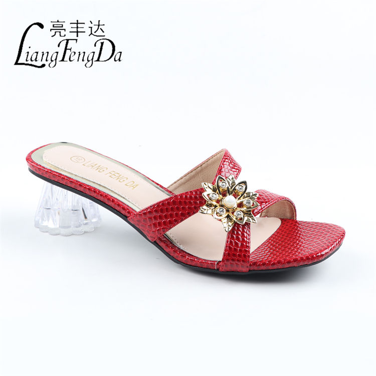 Supplier Fashion Summer Women Heels Slippers Chunky Open Toe Ladies Sandals Shoes China PU Print High Heels Wedges 1pair/opp Bag