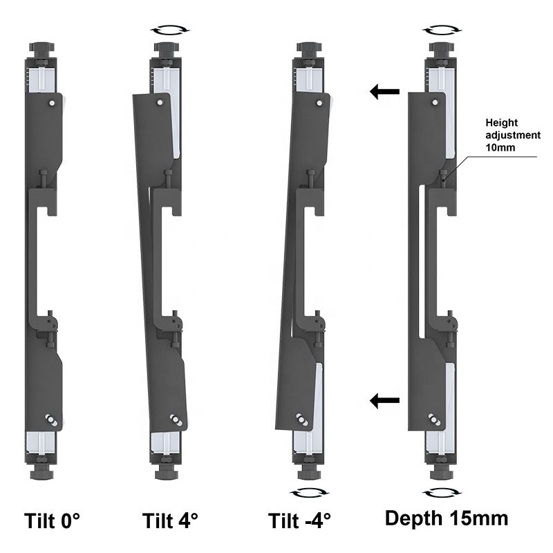 Micro-regolazione in profondità, altezza e di livellamentoStaffa Arms