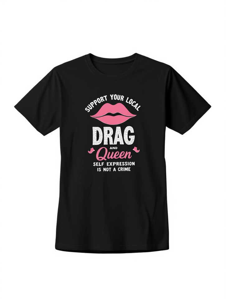Support Local Drag Queens T-Shirt Black Pink Lips Design Unisex Casual Short Sleeve Round Neck Machine Washable Jersey Fabric