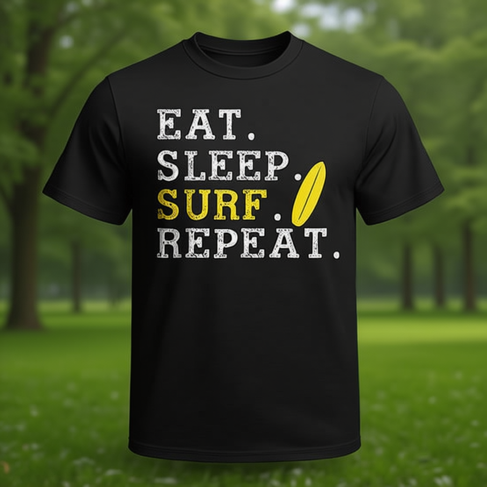 T-shirt con citazione sul surf Eat Sleep Surf Repeat Design Nero Unisex