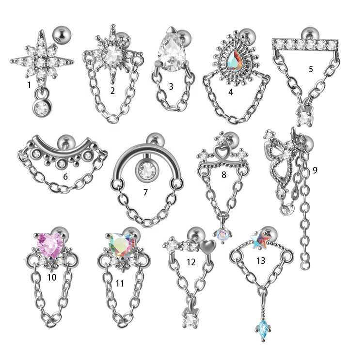 Orecchini a Catena in Acciaio Chirurgico con Zirconi per Trago ed Elice, Gioielli da Donna per Matrimoni e Feste, Moda all'Ingrosso 20G