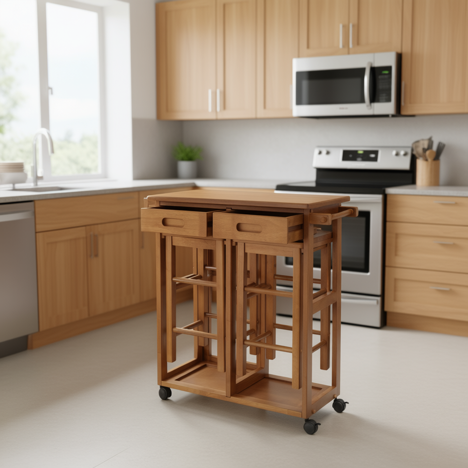 Set di carrelli da cucina Suzanne in teak a 3 pezzi con cassetti e ripiano per risparmiare spazio