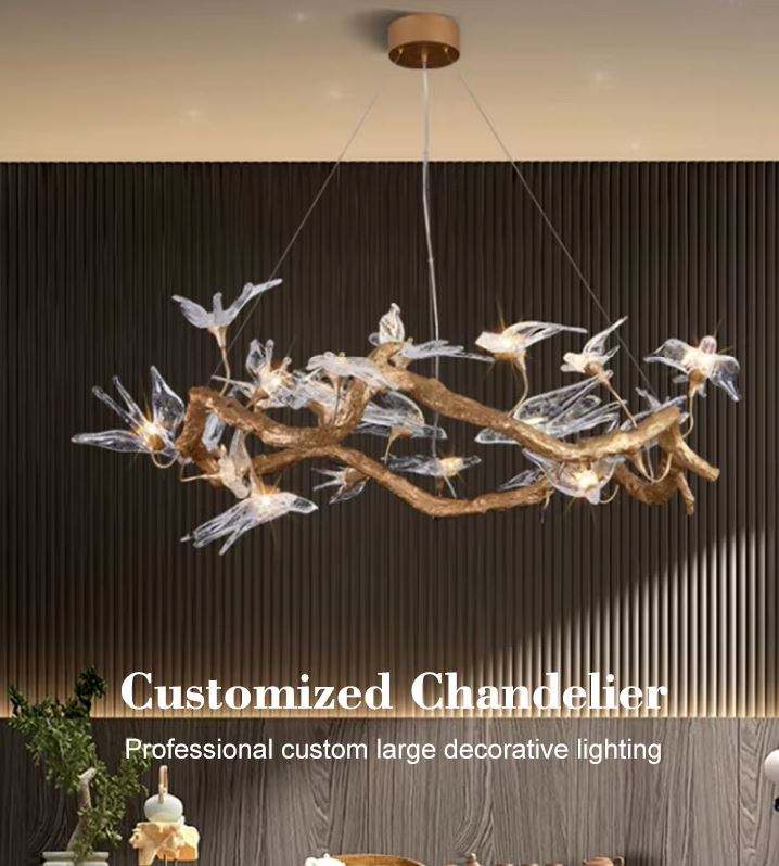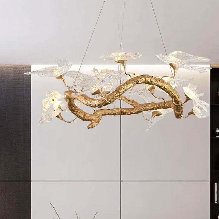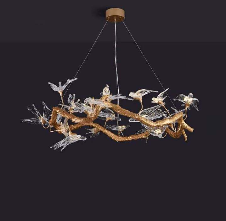 Lampadario a Forma di Rondine su Ramo di Rame per Soggiorno, Hotel, Villa, Sala da Pranzo, Camera da Letto, Lampadario Artistico in Vetro
