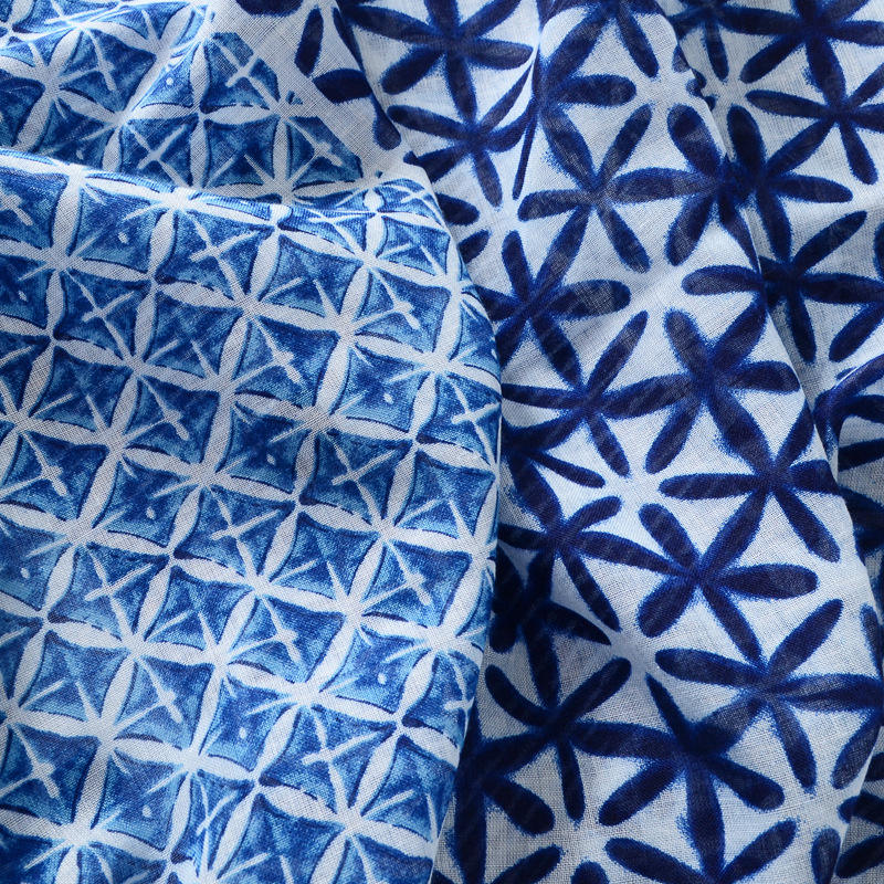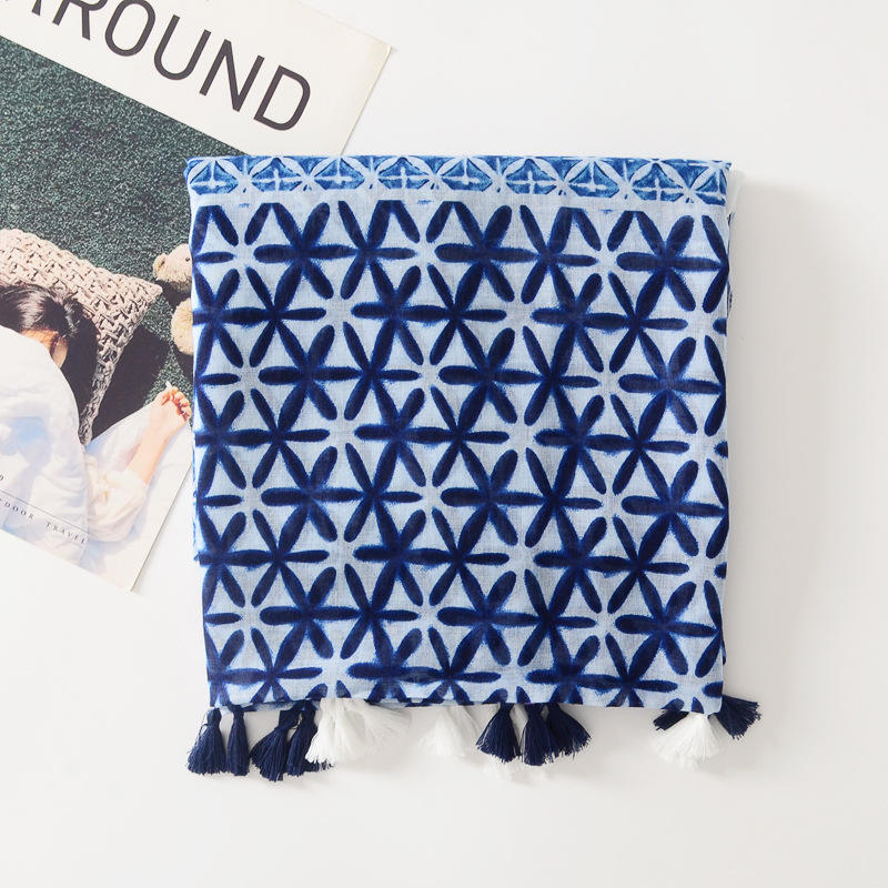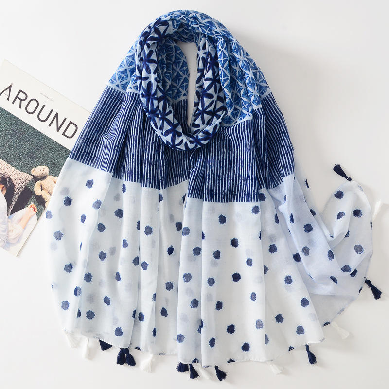 Sciarpa Lunga in Viscosa Stampata Blu e Bianca, Traspirante, per Donna, Protezione Solare, Telo da Spiaggia, Decorativa e Tradizionale