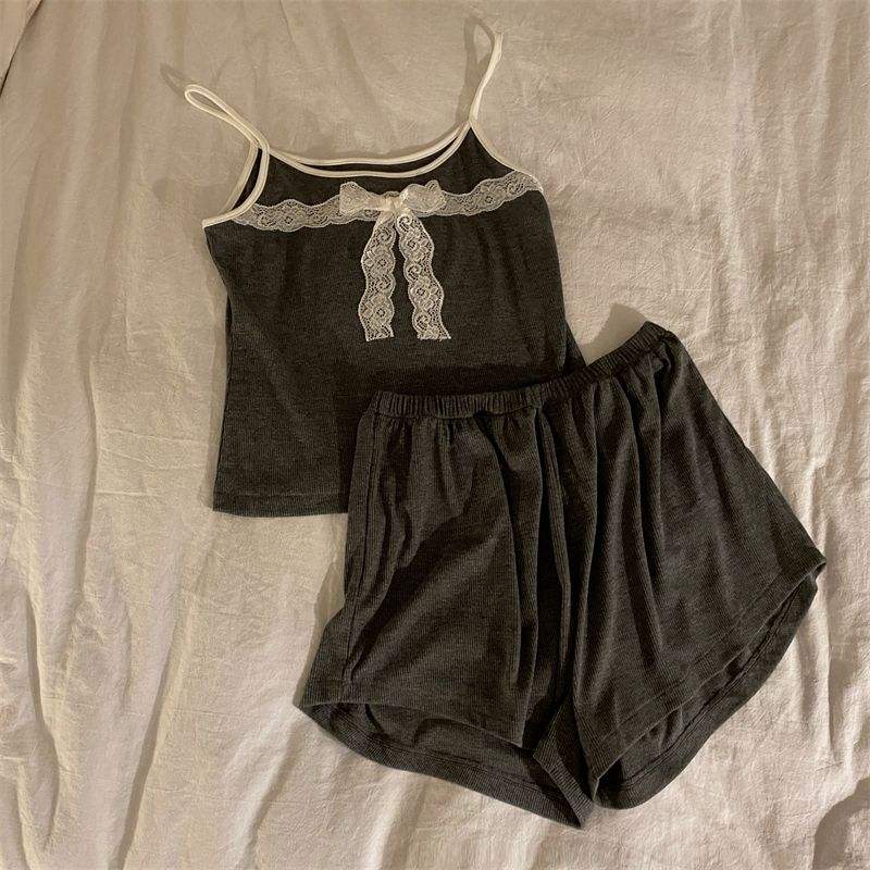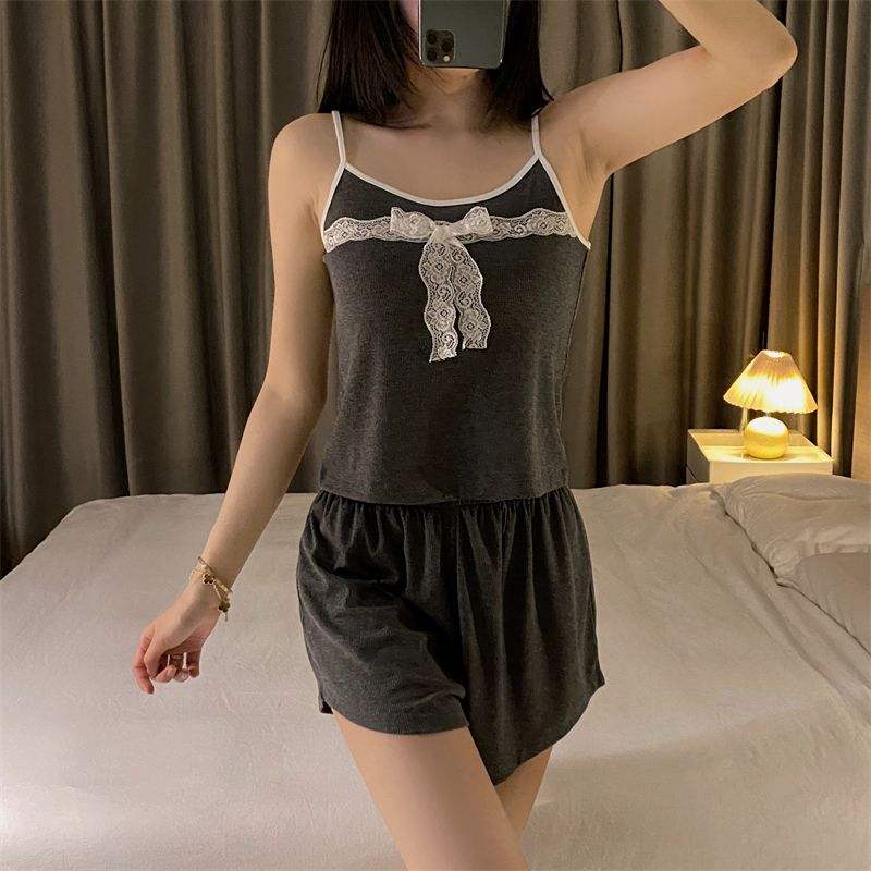 Set di biancheria da notte in pizzo con nodo a farfalla stile nuovo stile da donna abbigliamento da casa Sexy a due pezzi Set di indumenti da notte a manica corta