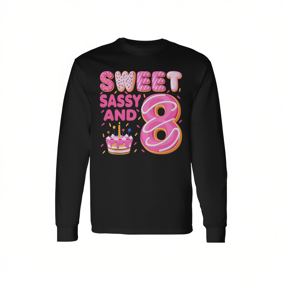 Maglietta a maniche lunghe per il 8° compleanno di Sweet Sassy and 8 Years Old, design promozionale ispirato alle ciambelle